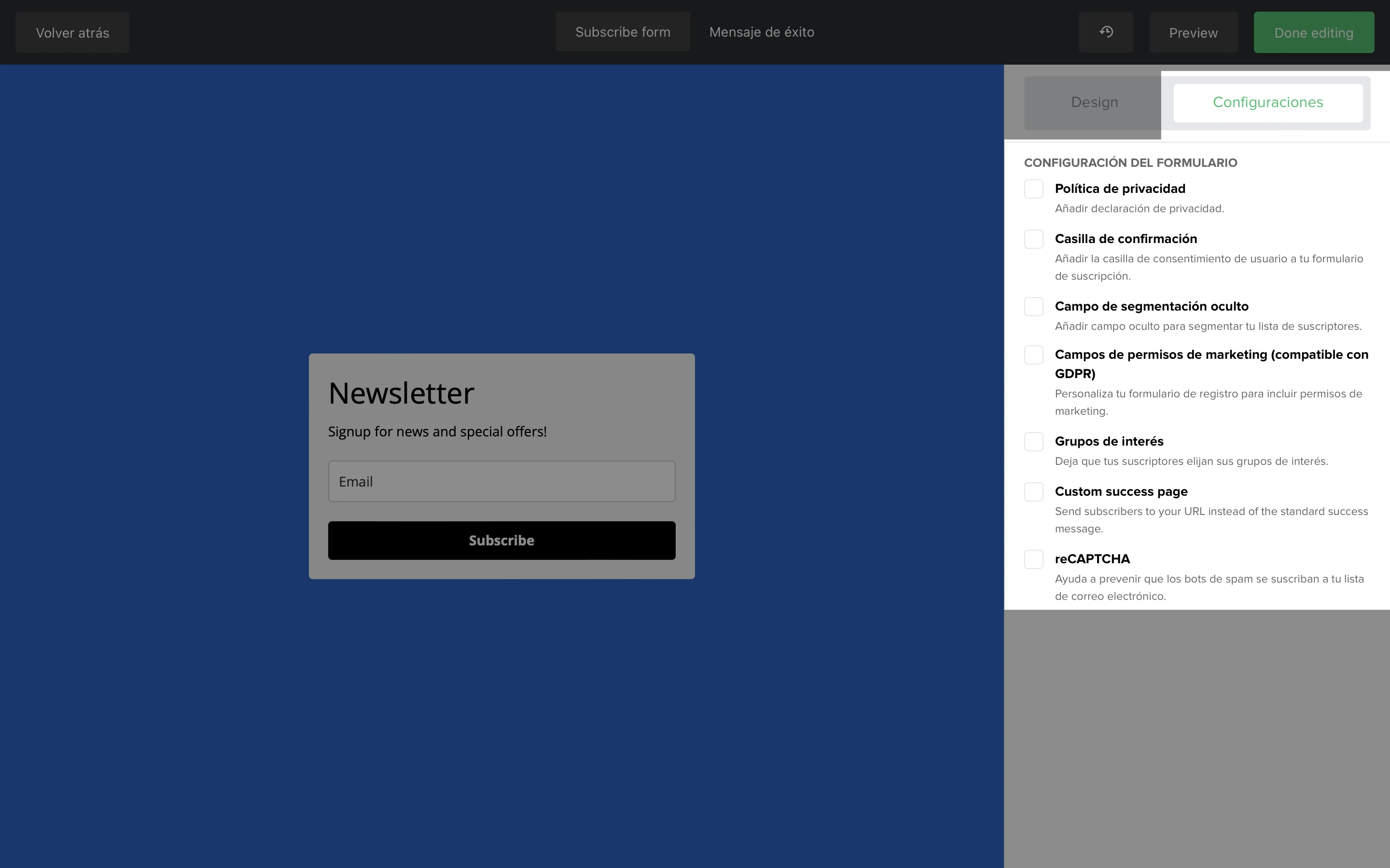 Grupos de interés: marca esta casilla para dar a los suscriptores la opción de elegir sus propios grupo de suscriptores.