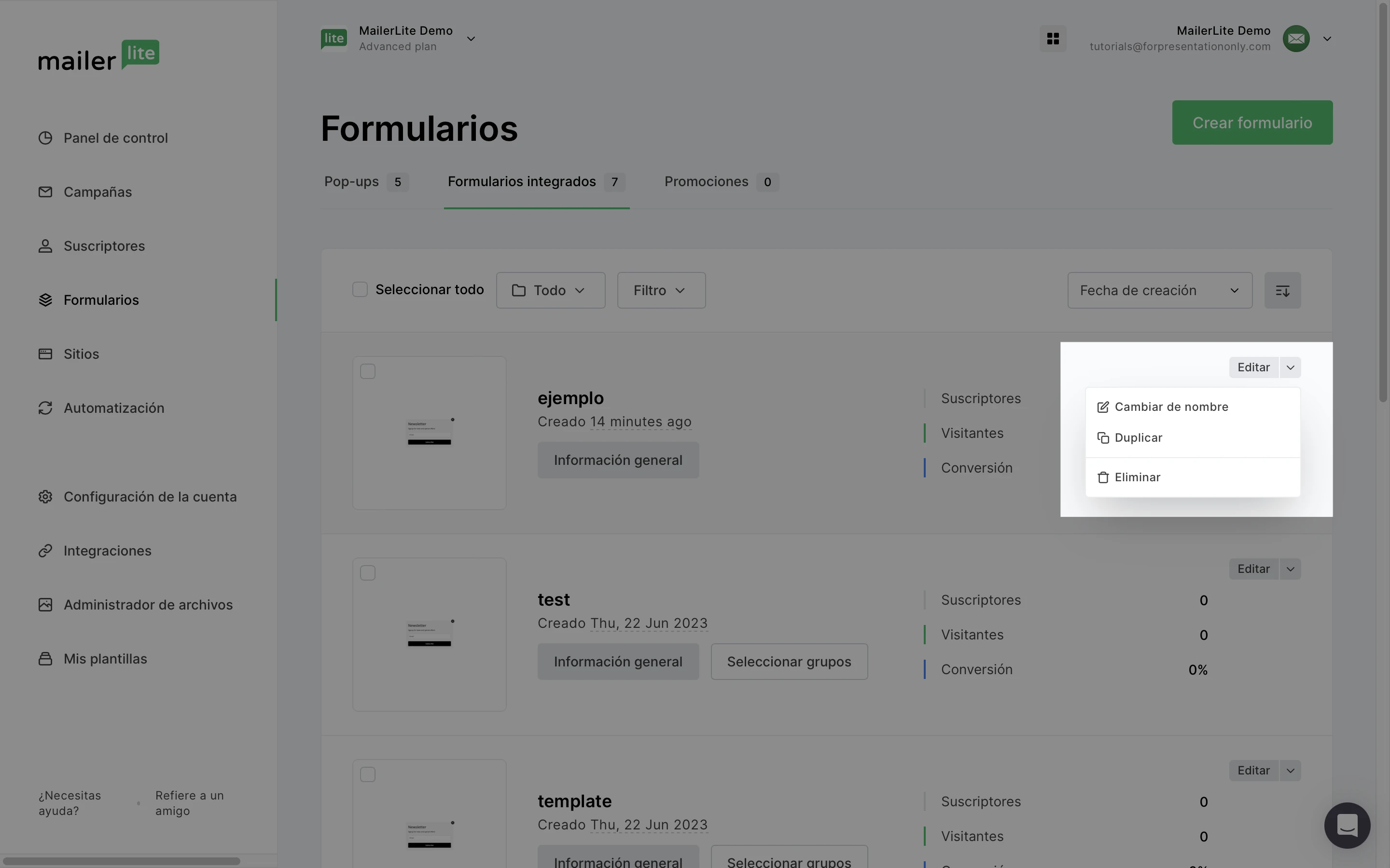 En la página de Formularios, busca el formulario que desea duplicar y dale clic en la flecha hacia abajo junto al botón de Editar.