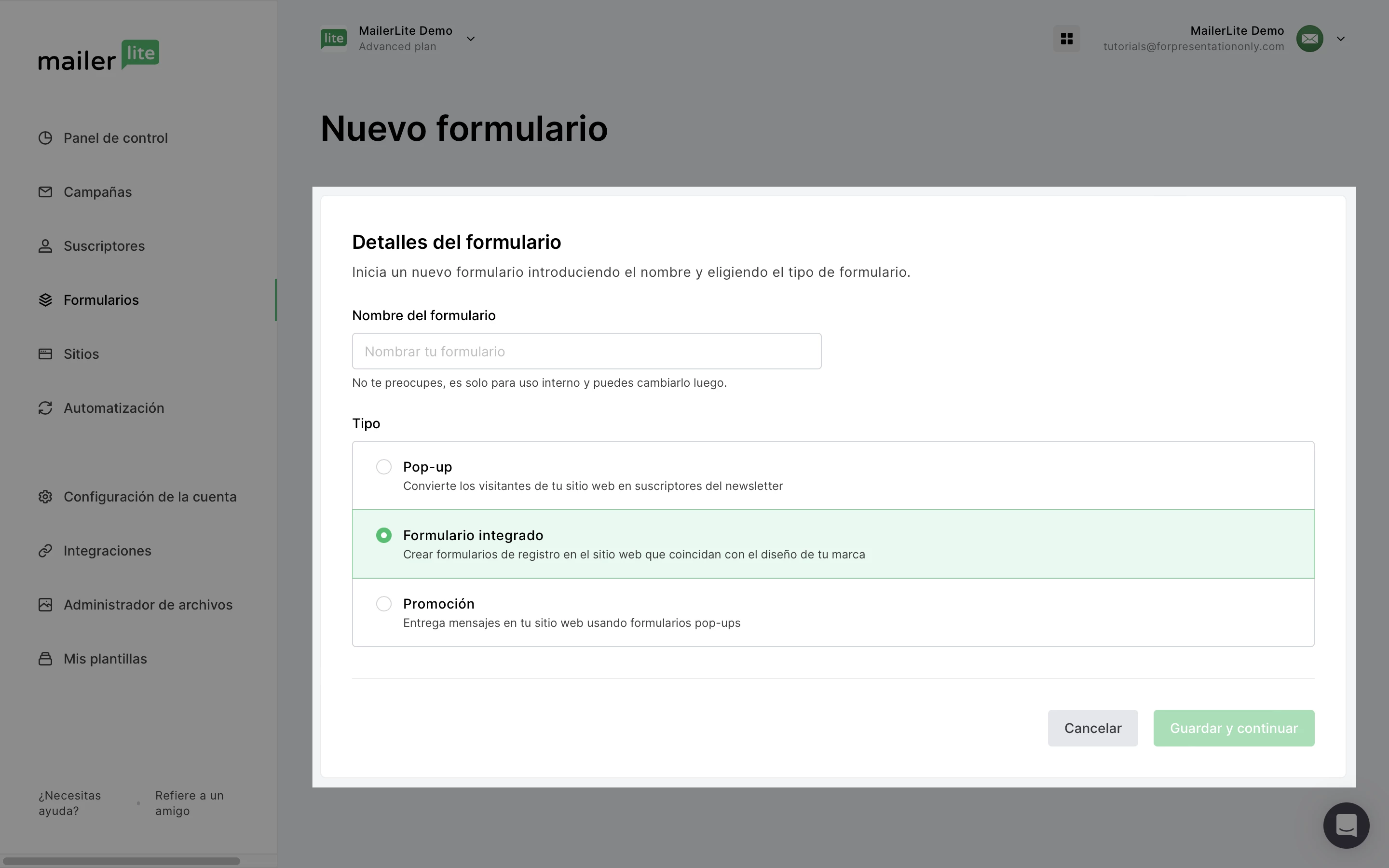Asigna un nombre a tu formulario (esto es solo para fines internos y puedes cambiarlo más adelante) y selecciona el tipo de formulario a Formulario integrado.