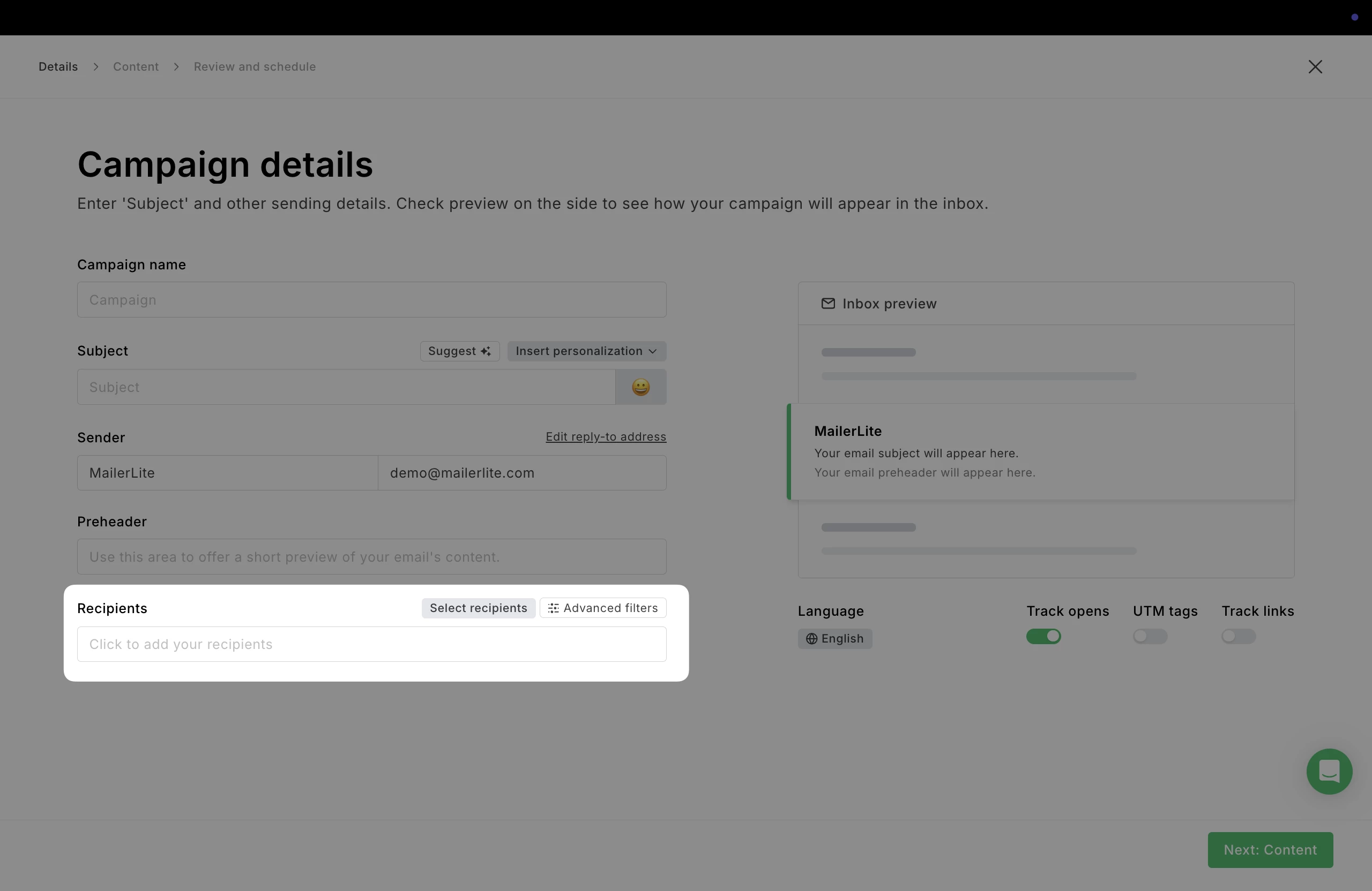 Envío inteligente: Utiliza la inteligencia artificial para analizar las interacciones pasadas de cada suscriptor, las fechas de suscripción y las zonas horarias para determinar el momento óptimo para enviarles tus correos electrónicos. Solo disponible en los planes avanzados de MailerLite.