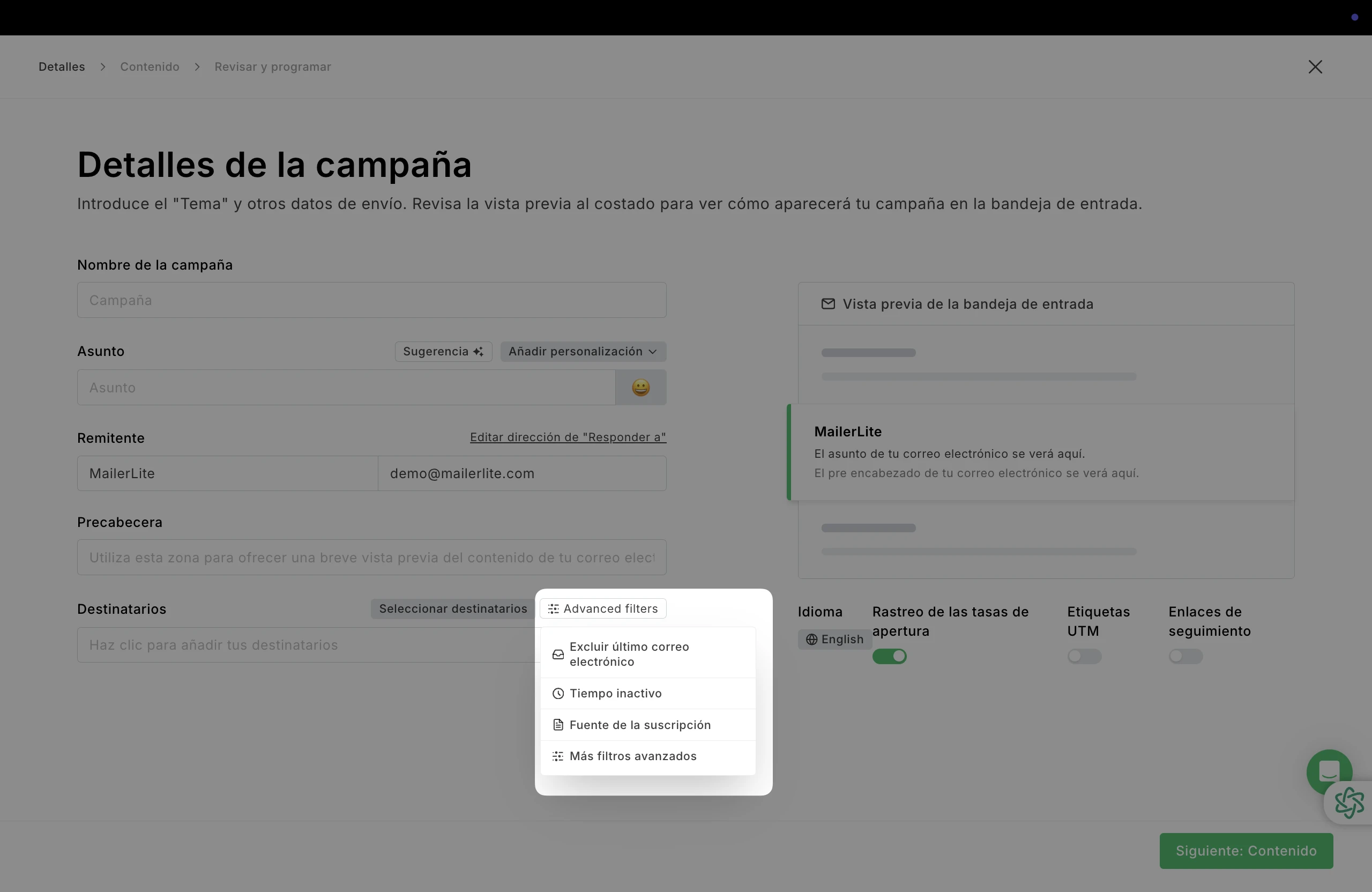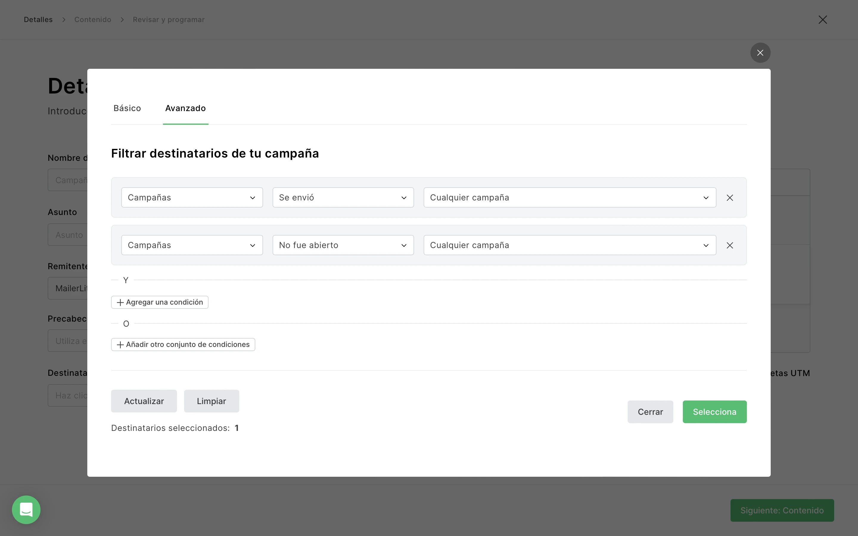 Aquí puedes seleccionar destinatarios utilizando filtros. Por ejemplo, la opción avanzada resulta útil si deseas enviar tu campaña a: