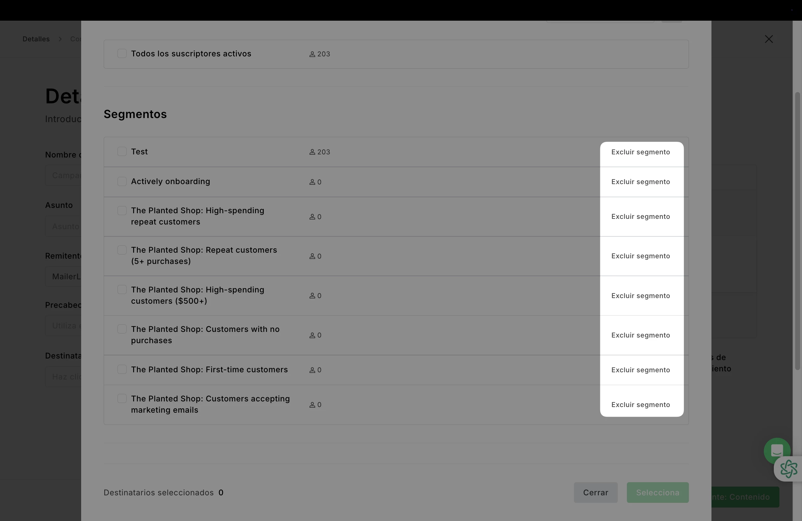 Aquí puedes seleccionar qué grupos y/o segmentos quieres que reciban esta campaña.