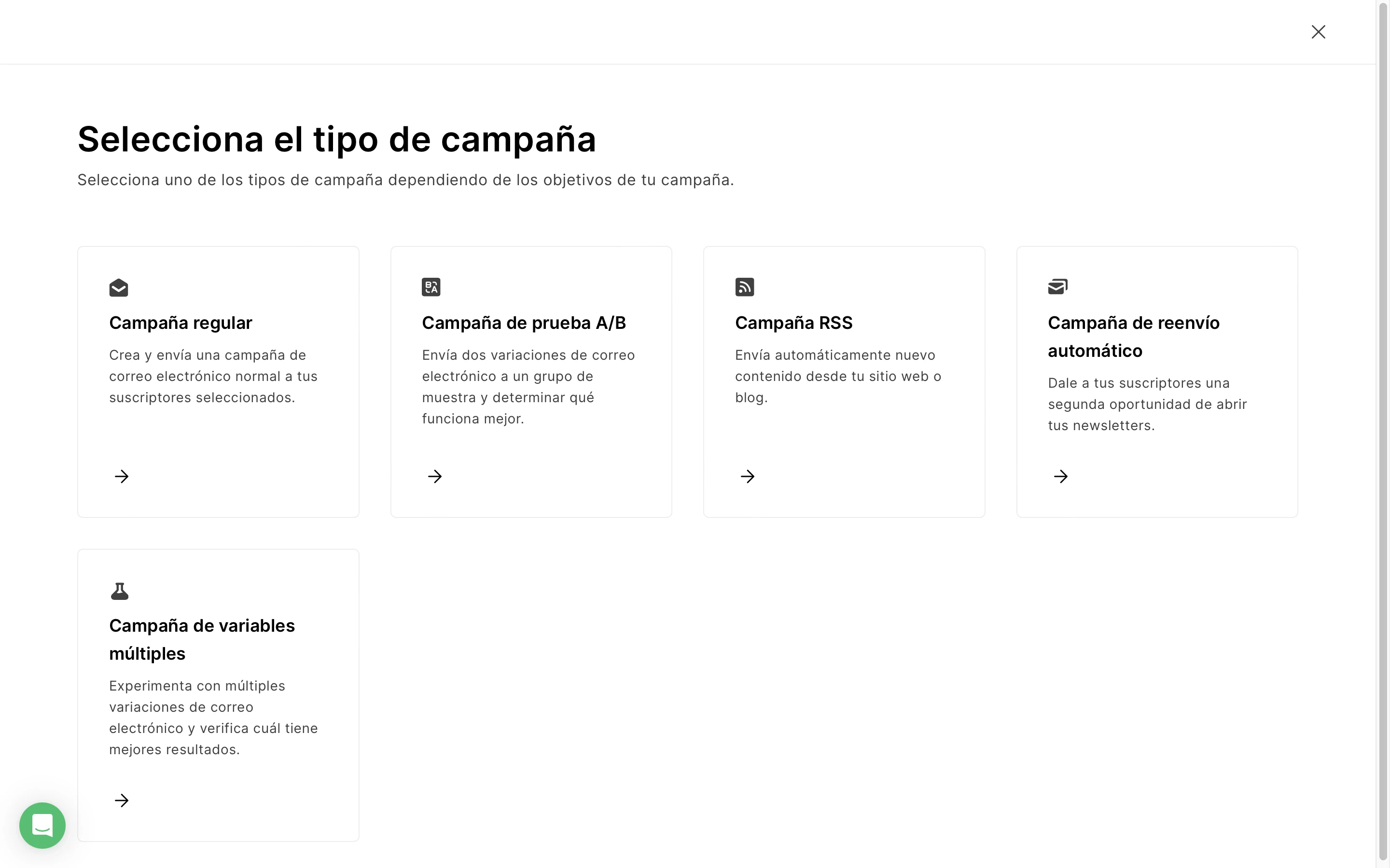 Hay diferentes tipos de campañas para elegir, incluidas campañas regulares, campañas RSS, reenvío automático y las pruebas A/B.