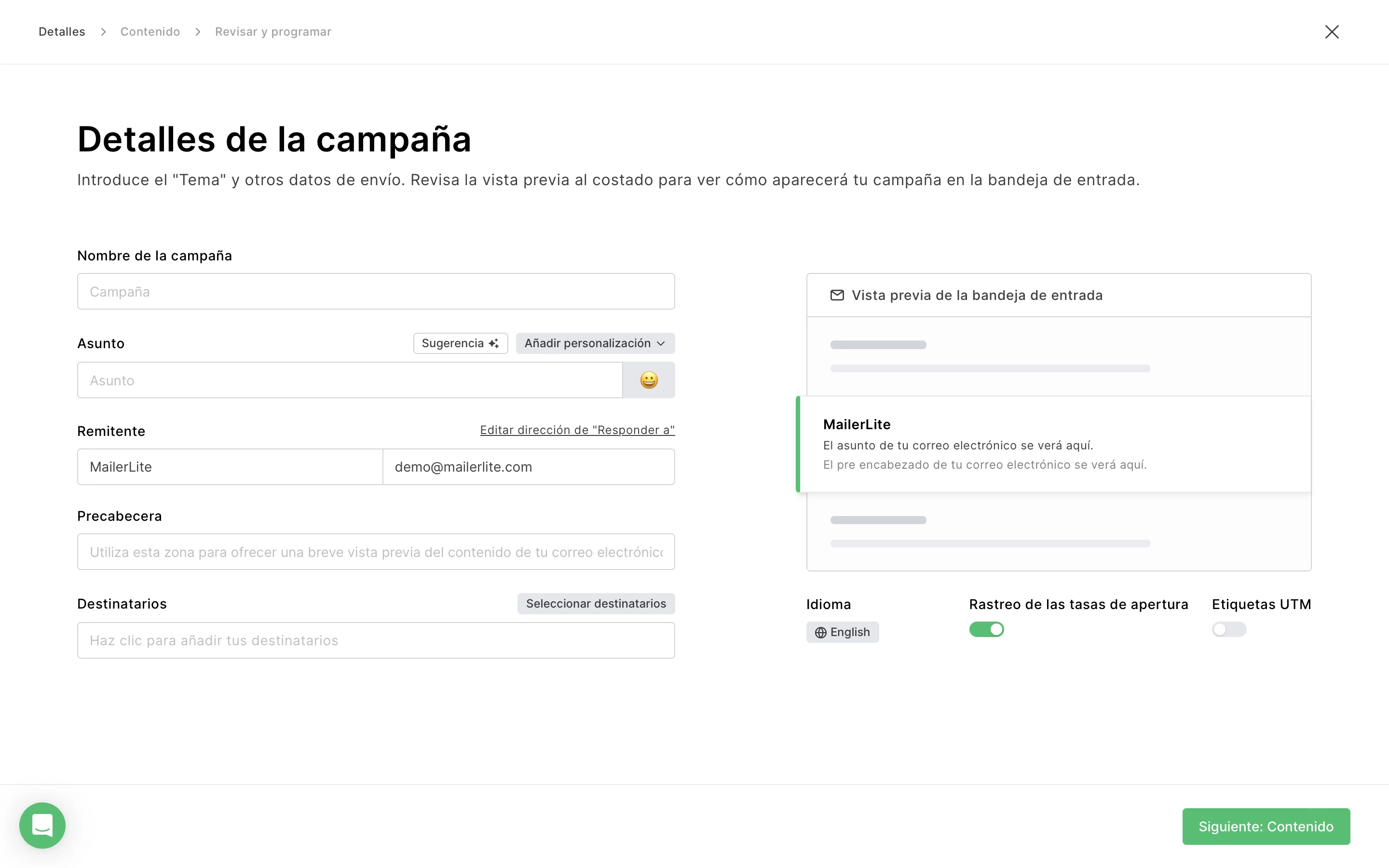 Una vez que estés satisfecho con los detalles de tu campaña, haz clic en Siguiente:Contenido.
