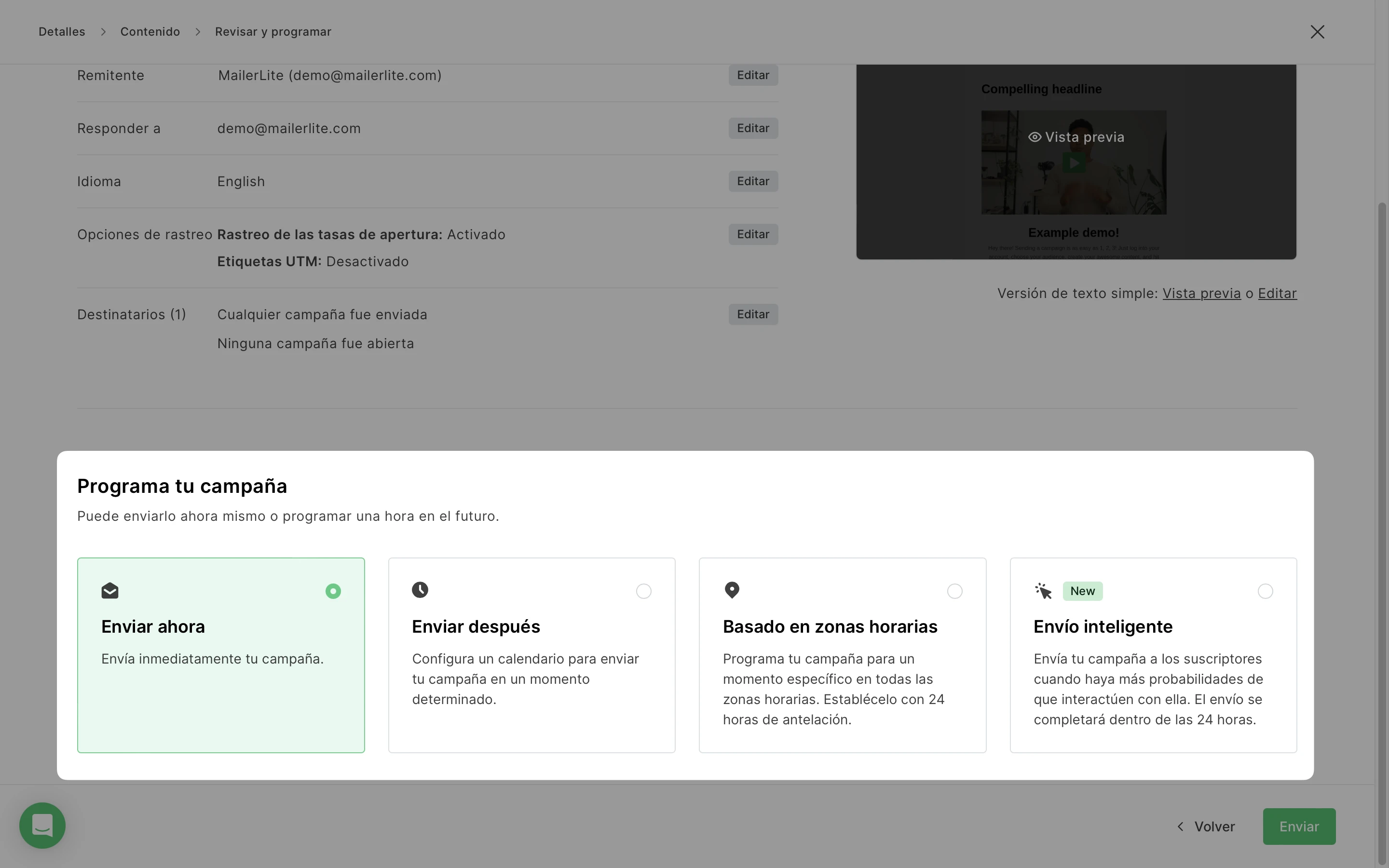 Cuando llegues al paso de la programación, tendrás 4 opciones para enviar la campaña: