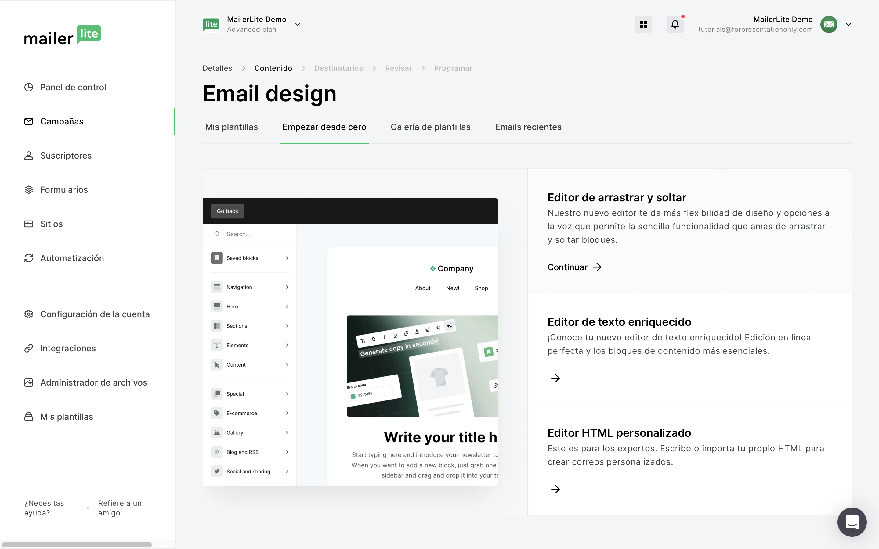 Si deseas crear una nueva campaña desde el inicio, puedes seleccionar entre el editor de arrastrar y soltar, el editor de texto enriquecido o el editor de HTML personalizado (sólo para planes de pago).