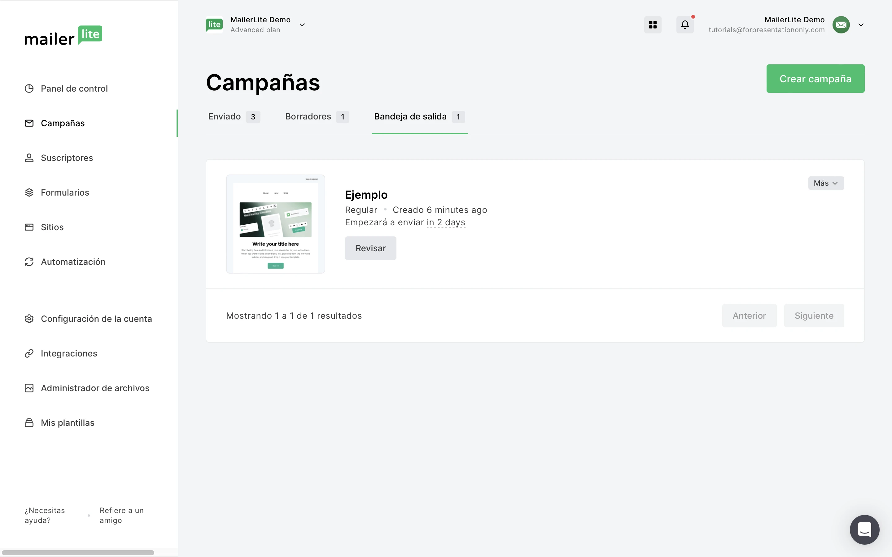 Una vez programada, tu campaña aparecerá en tu bandeja de salida hasta que se envíe. Una vez enviada, ésta aparecerá en la carpeta de Enviados.