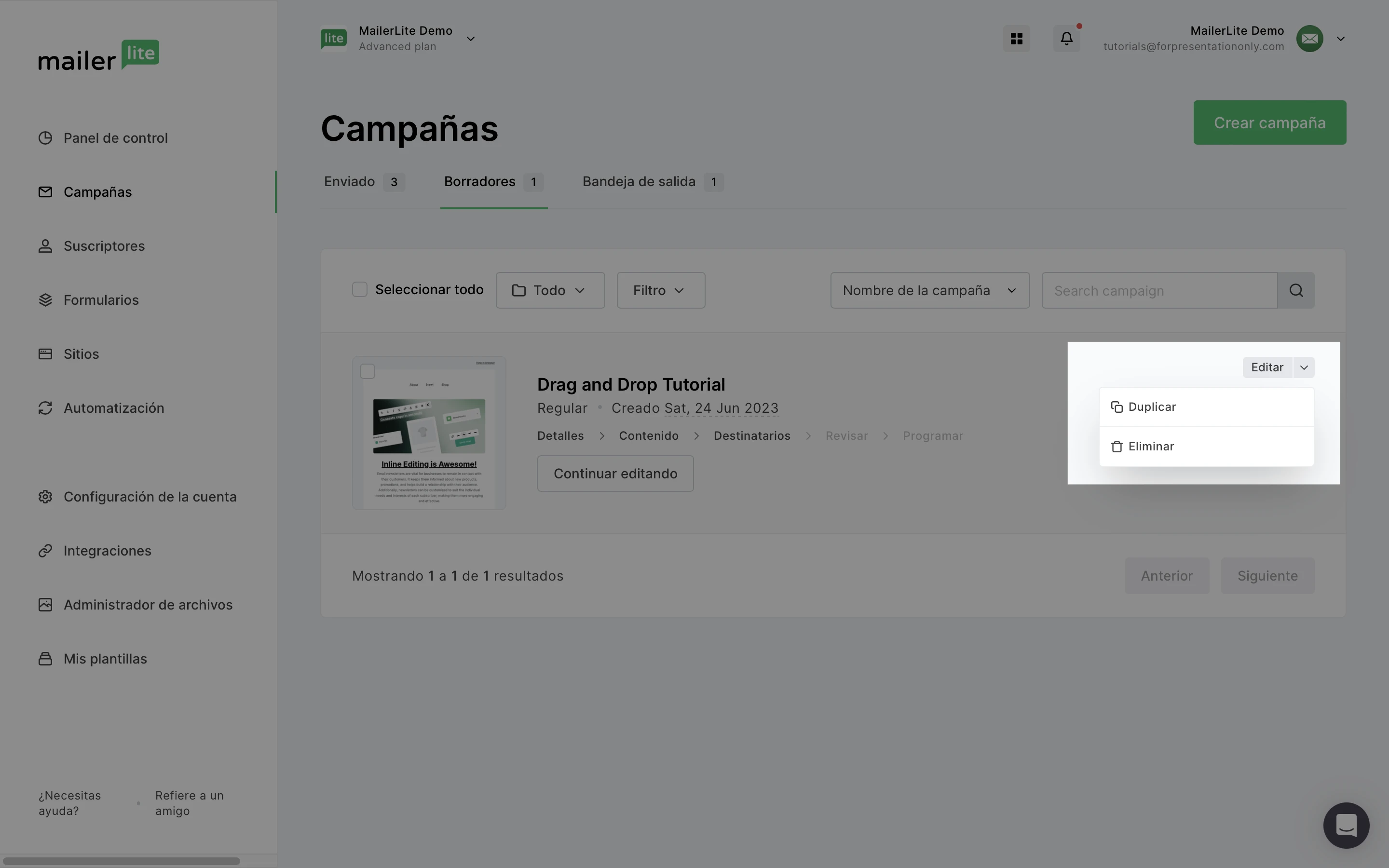 Aparecerá una copia de la campaña en la pestaña de Borradores.