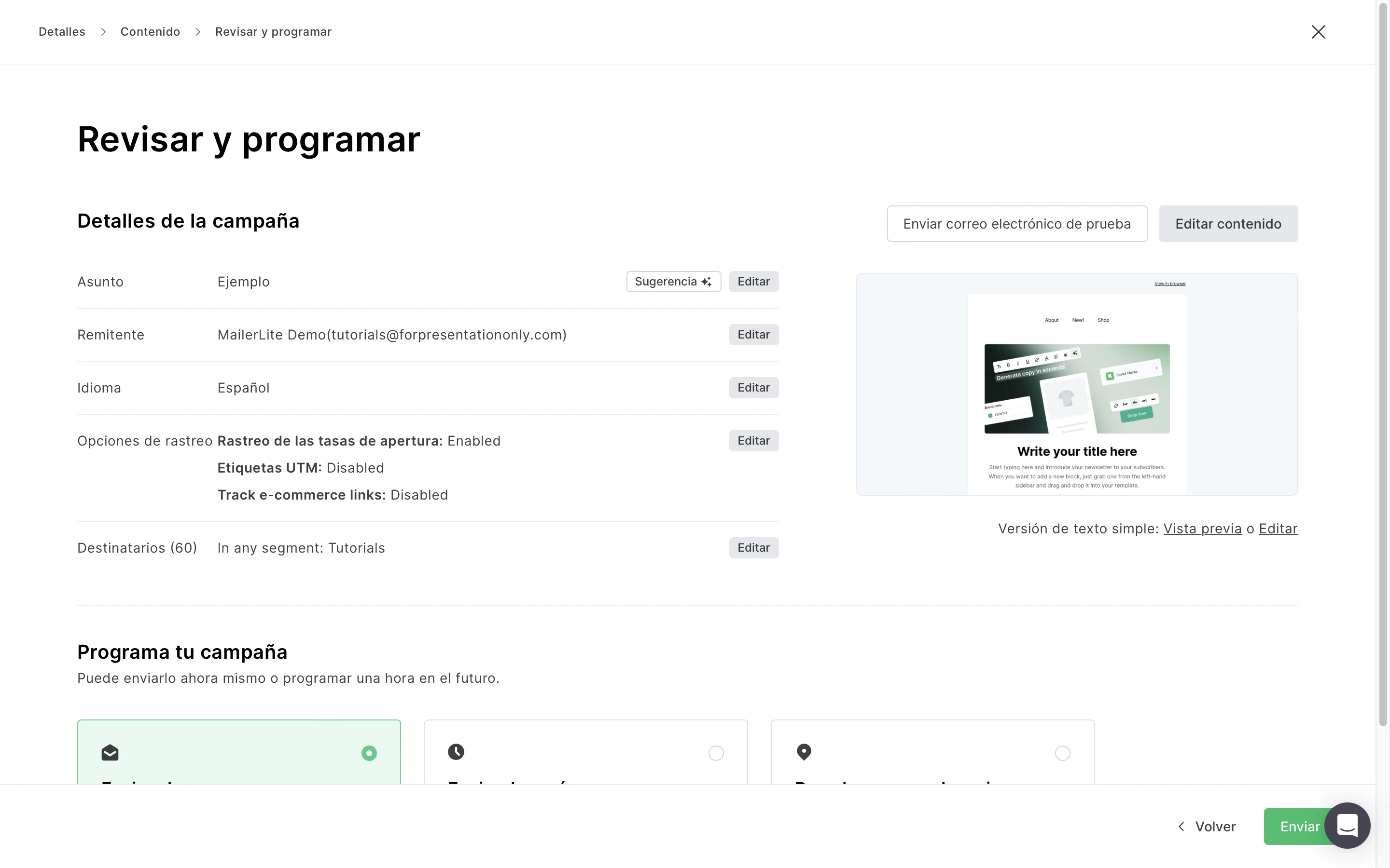 Enviar más tarde: configura un cronograma para enviar tu campaña en un momento específico
