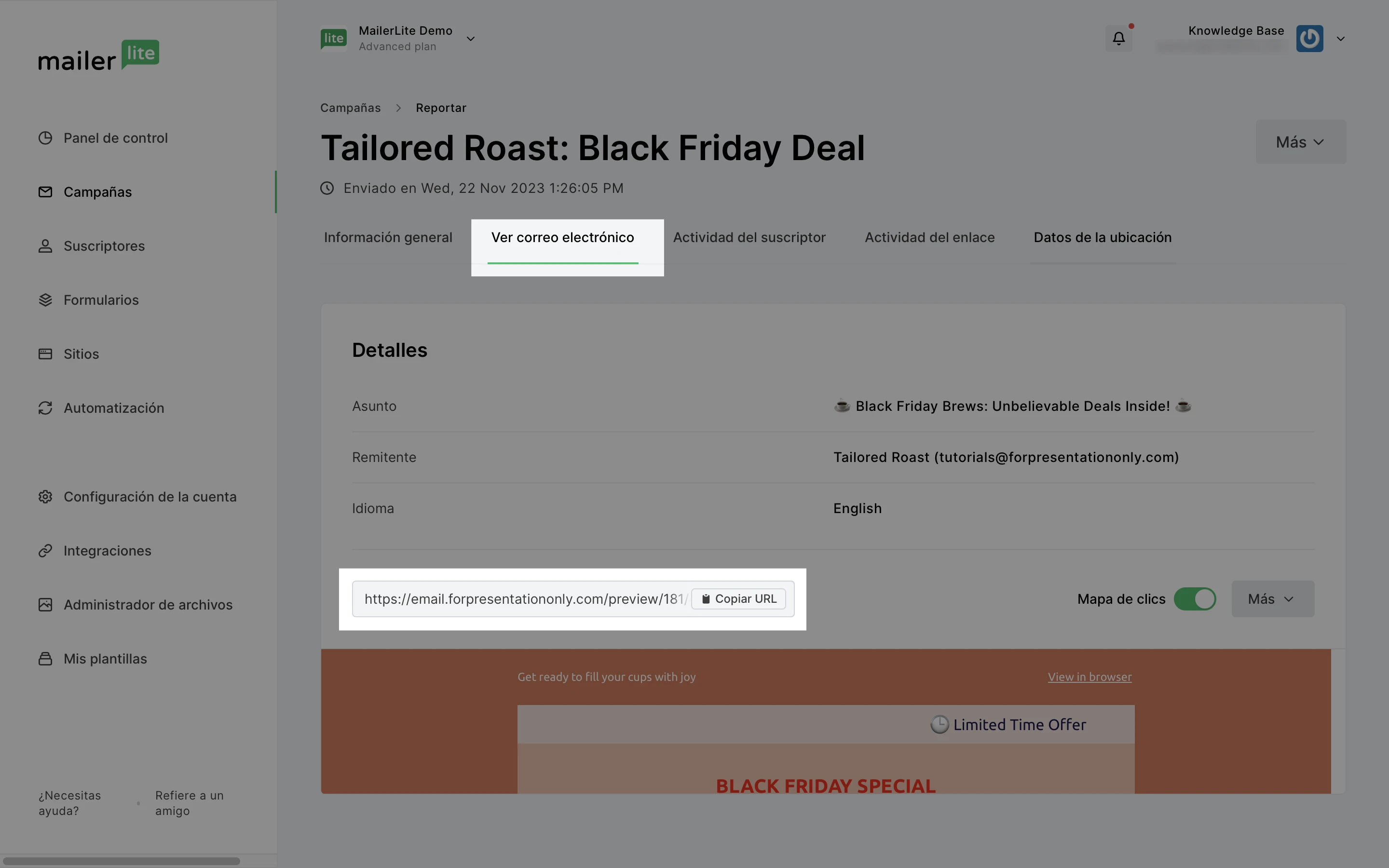 Una vez enviada una campaña, podrás acceder al correo electrónico utilizando el enlace de vista previa. Para localizarlo, haz lo siguiente: