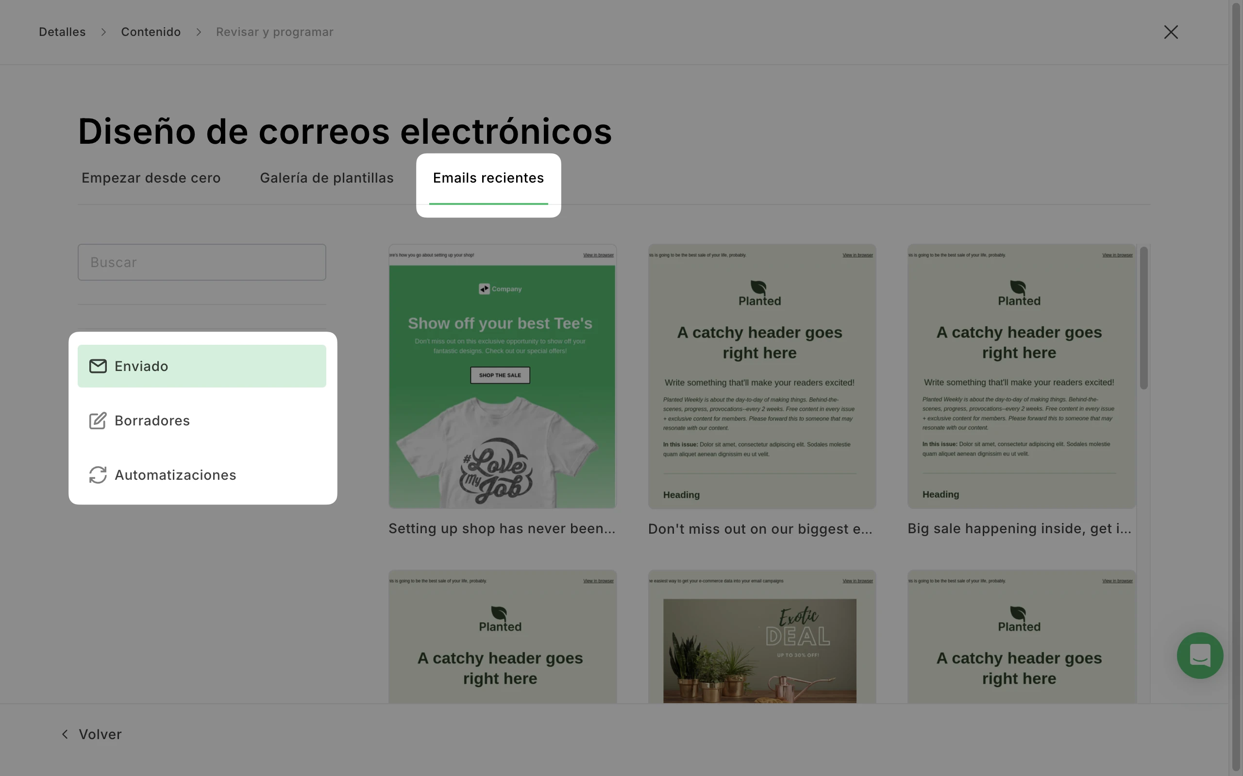 Al reutilizar correos electrónicos recientes, puedes alternar para ver tus últimos borradores, campañas enviadas y correos electrónicos de automatización. Luego puedes seleccionar una de esas campañas para crear un nuevo newsletter.