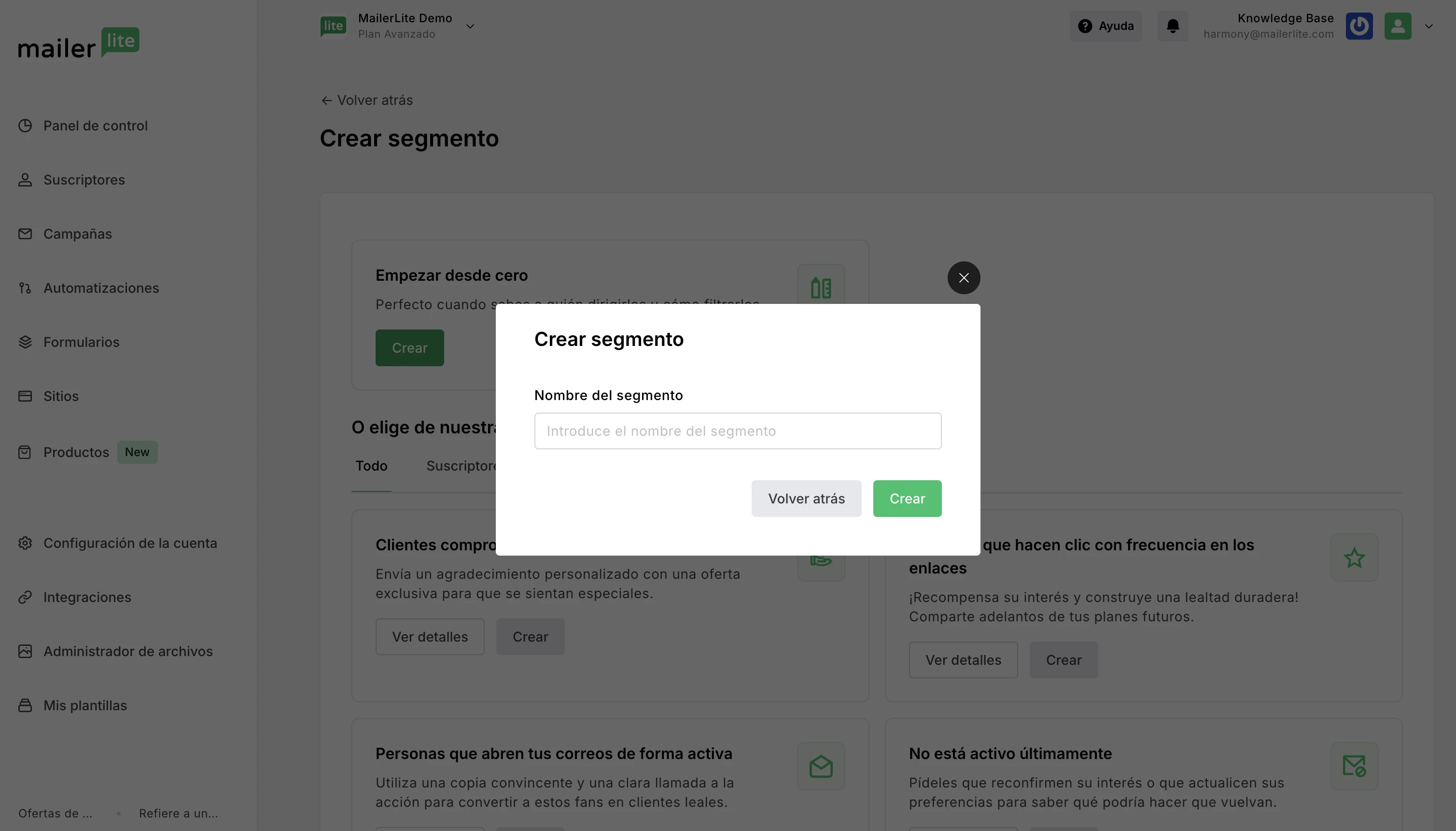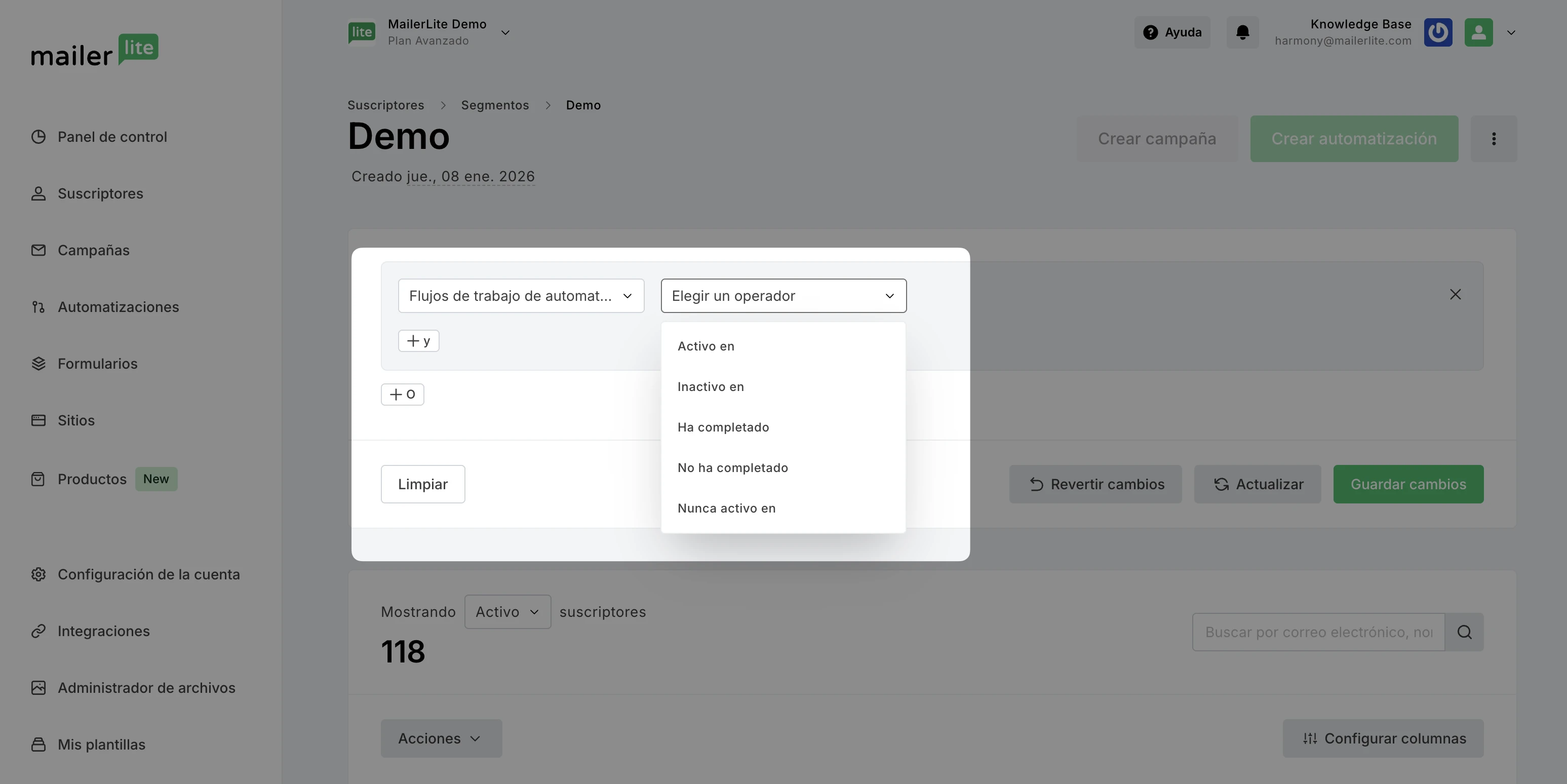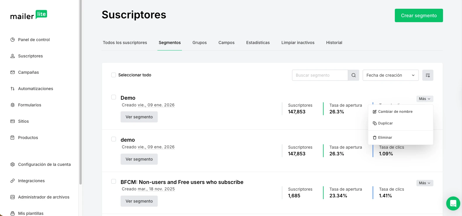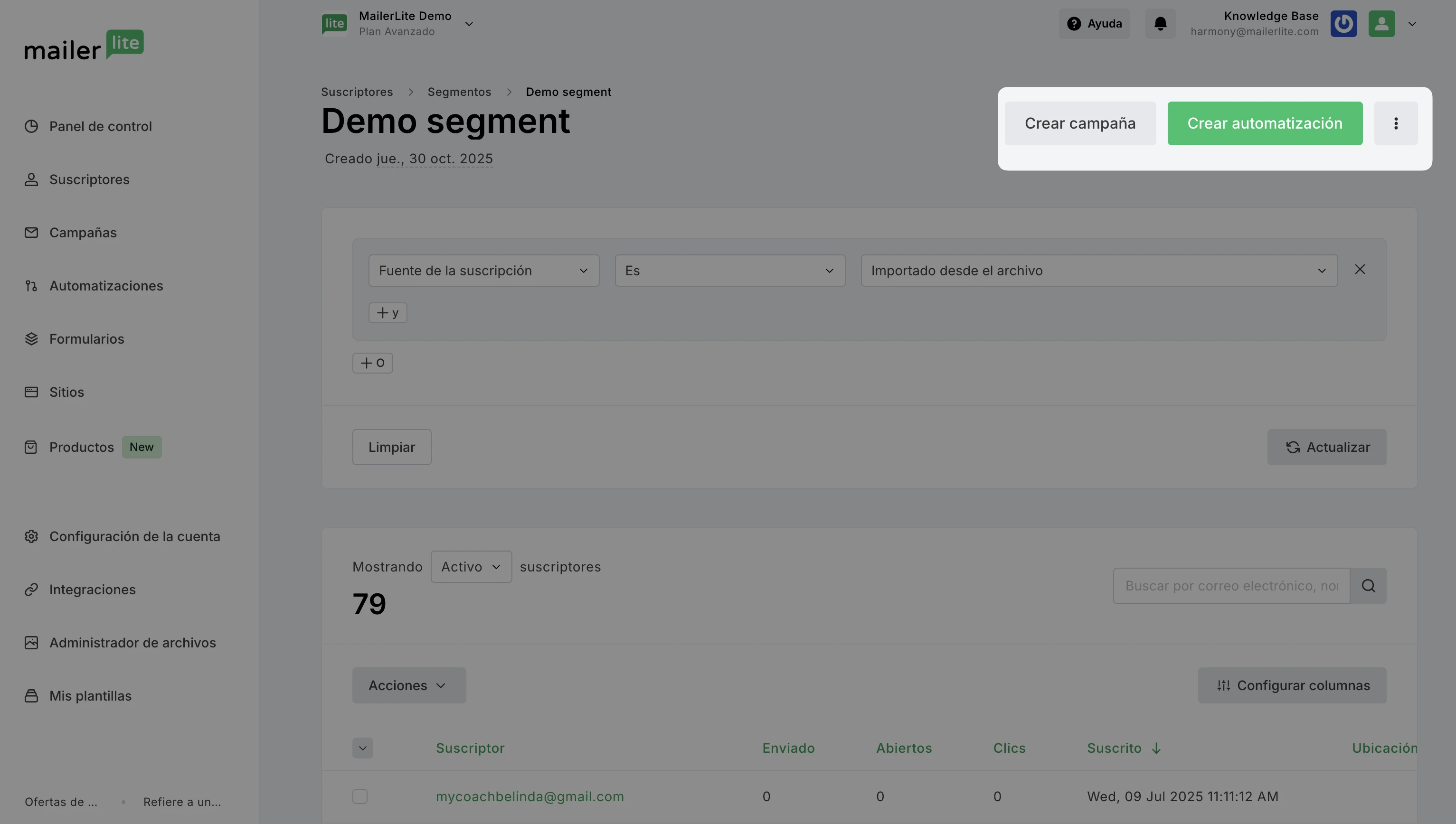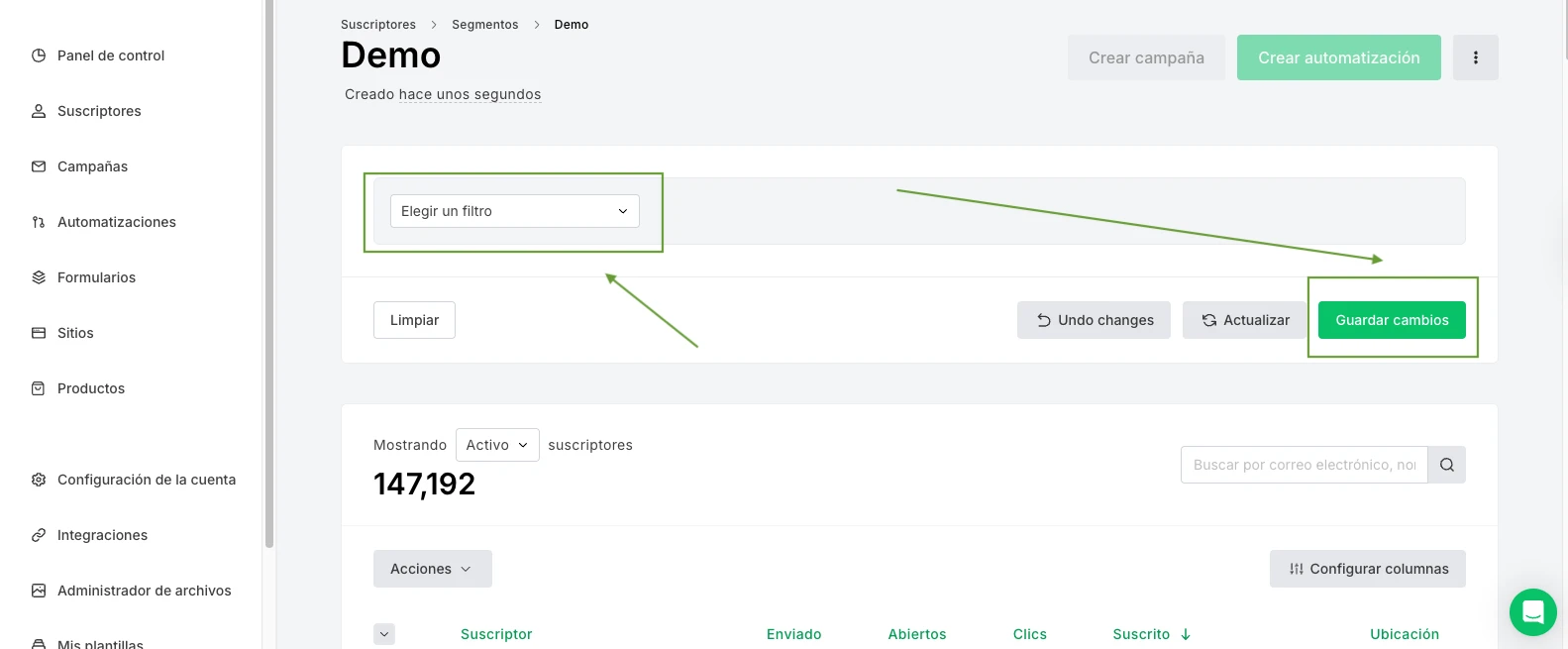 Una vez creado el segmento, todos los suscriptores pasados y futuros que cumplan esas condiciones se incluirán automáticamente en el segmento.