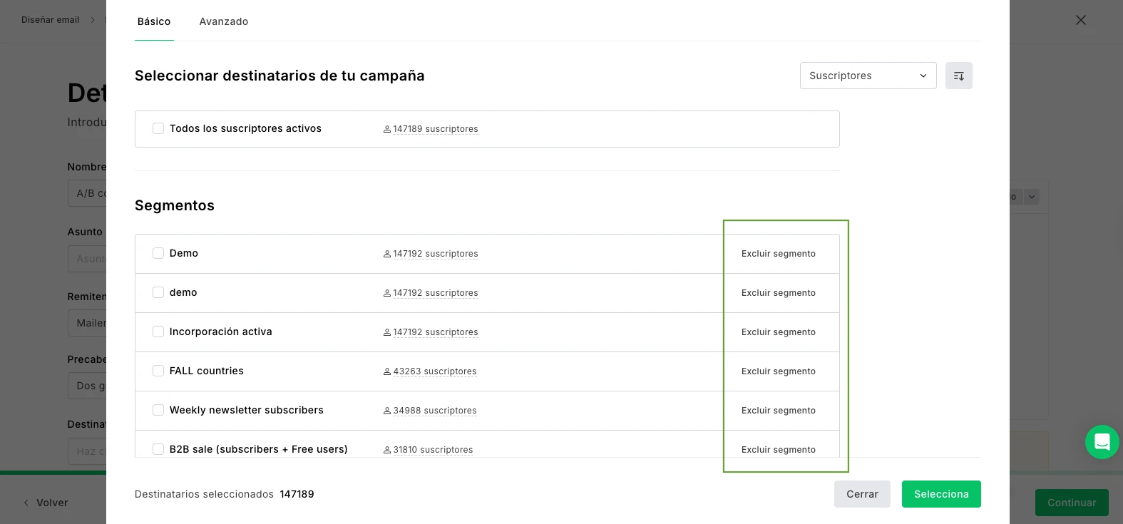 Al seleccionar los destinatarios, haz clic en el botón Excluir segmento a la derecha del segmento que no quieres que reciba esa newsletter.