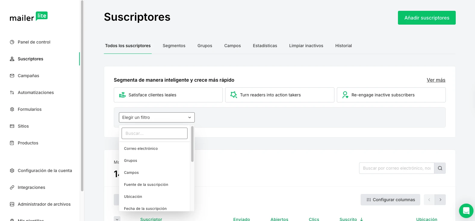 Ve a la página de Suscriptores y haz clic en la pestaña Segmentos.