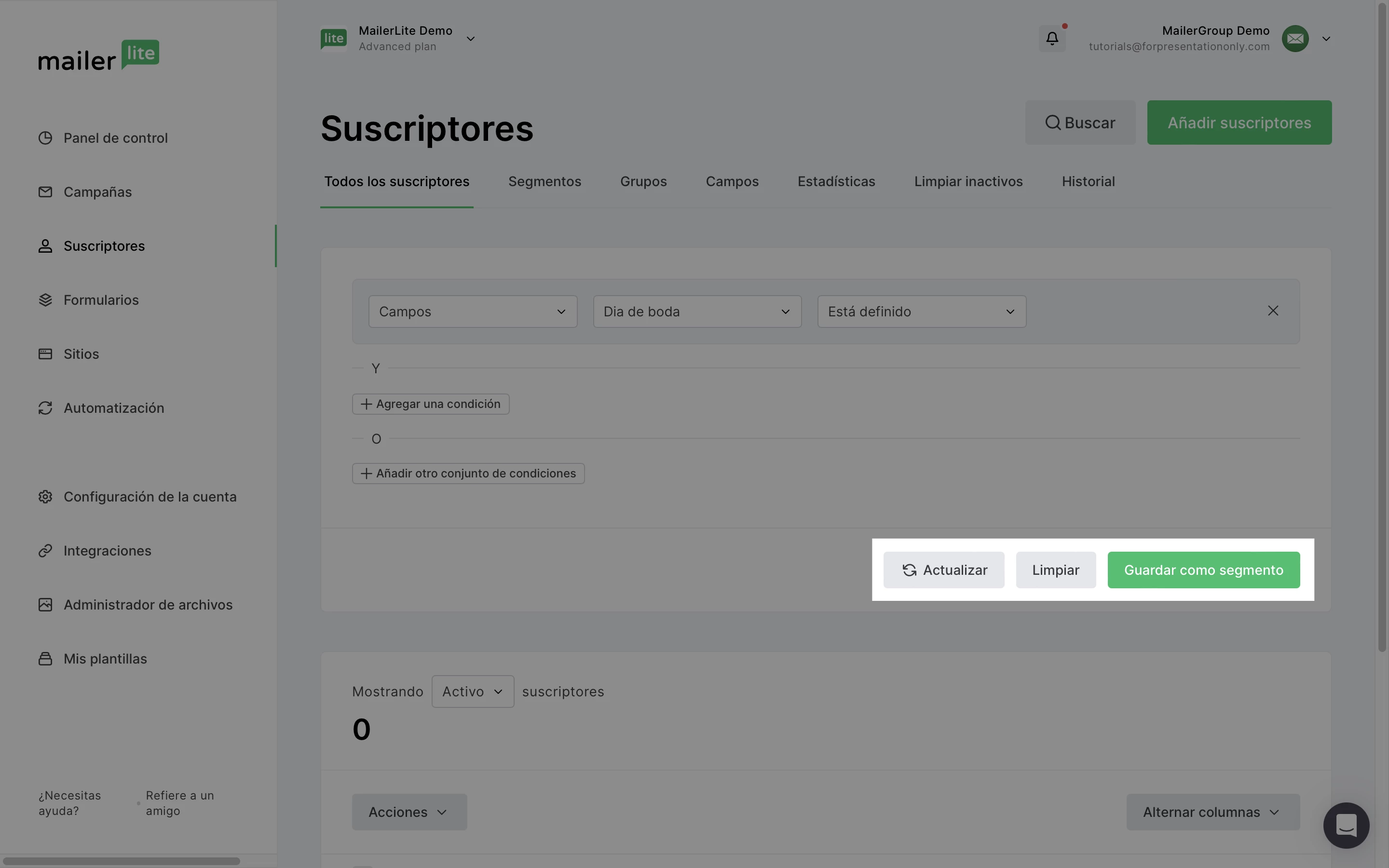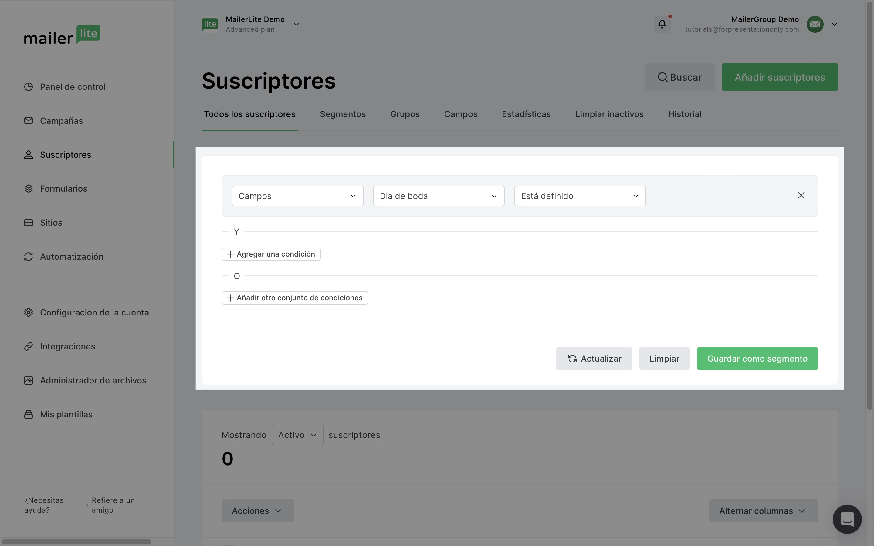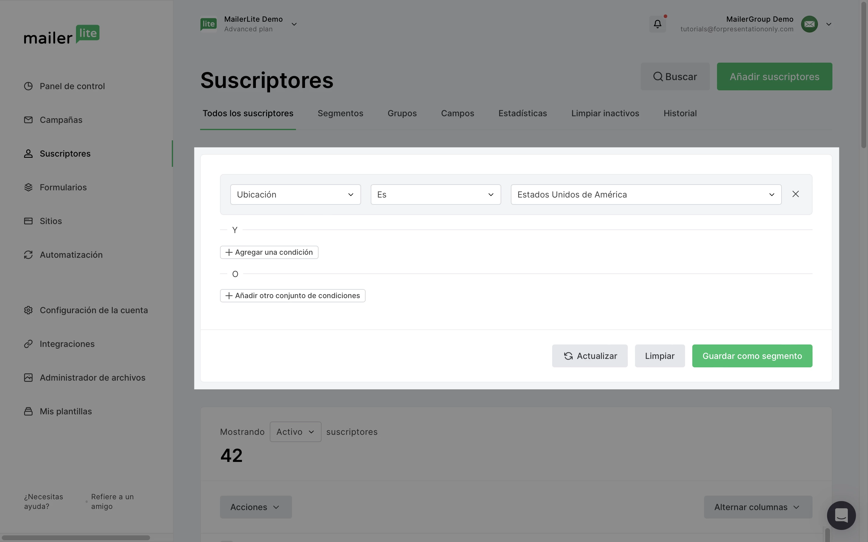 Una vez creado un segmento, todos los suscriptores pasados y futuros que cumplan con esas condiciones se incluirán en el segmento automáticamente.