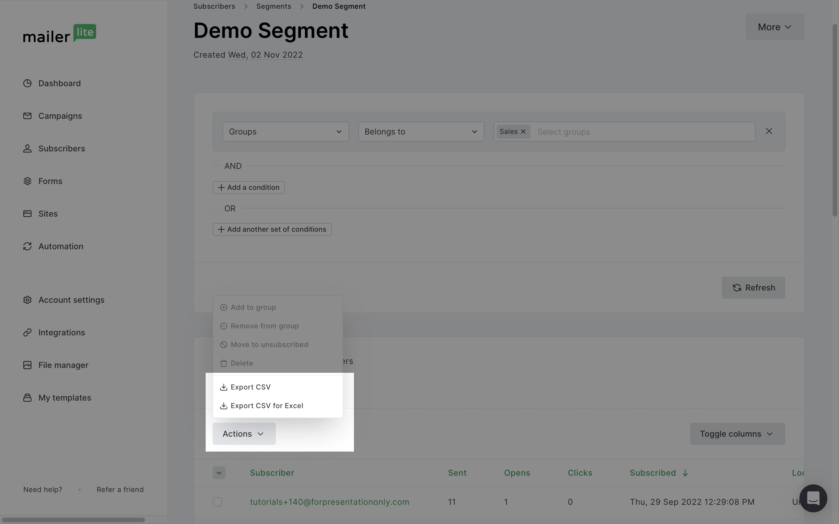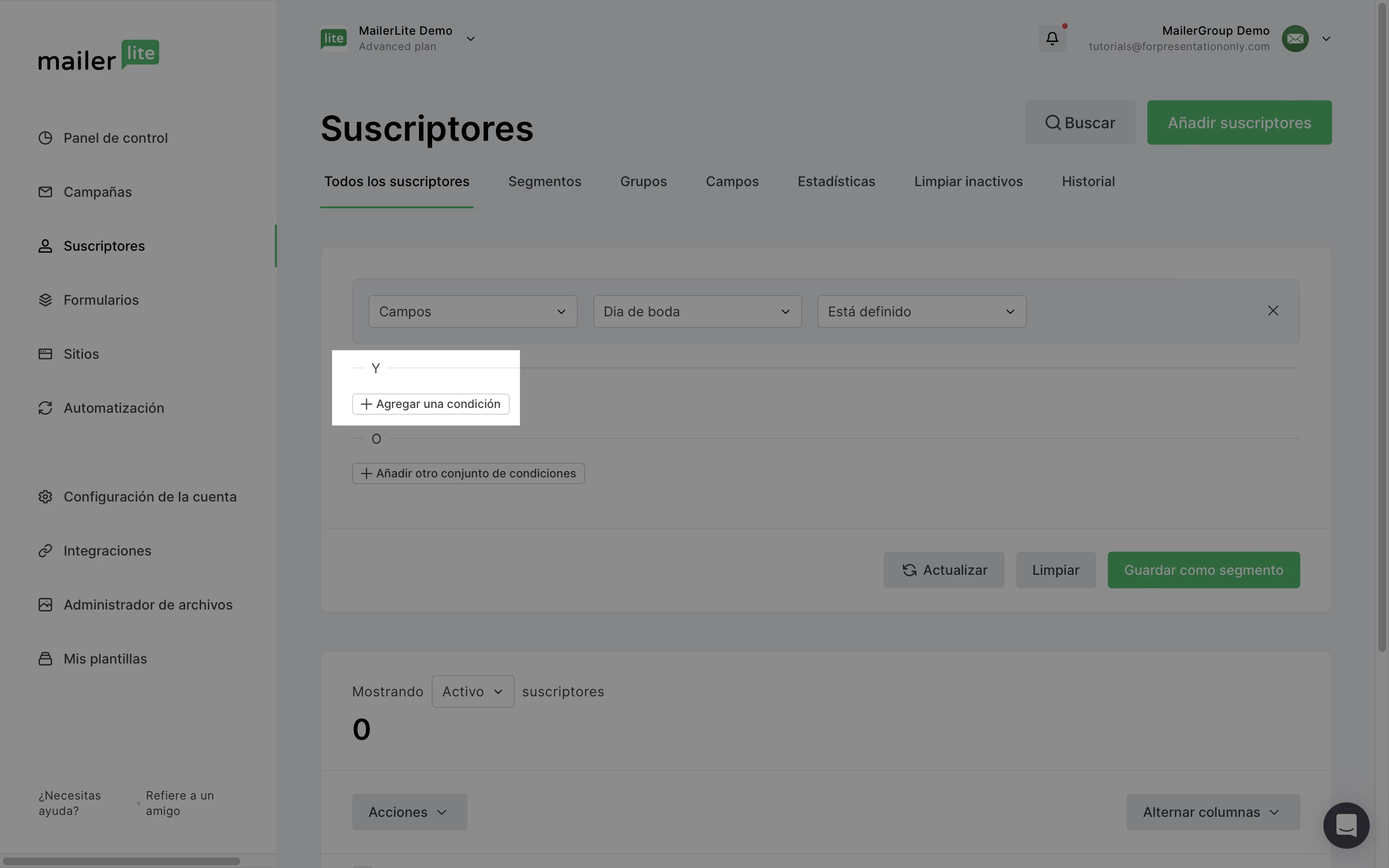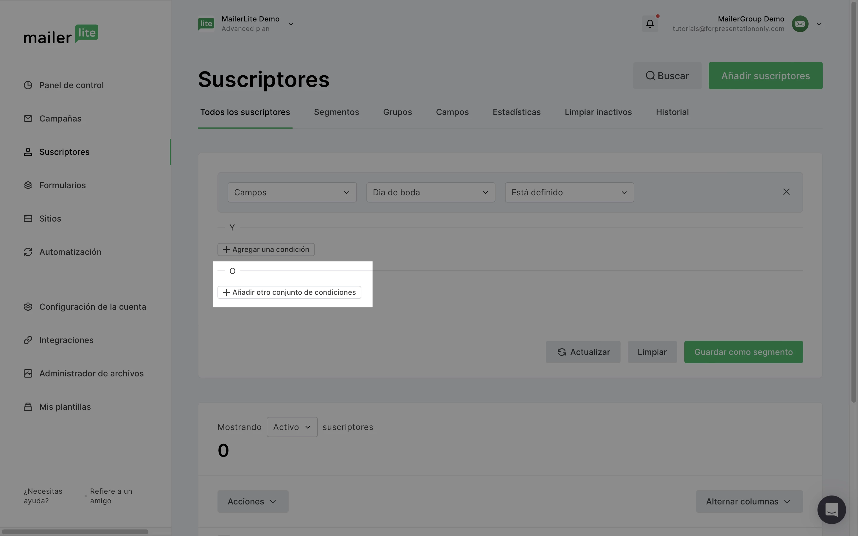 Una vez creado un segmento, todos los suscriptores pasados y futuros que cumplan con esas condiciones se incluirán en el segmento automáticamente.