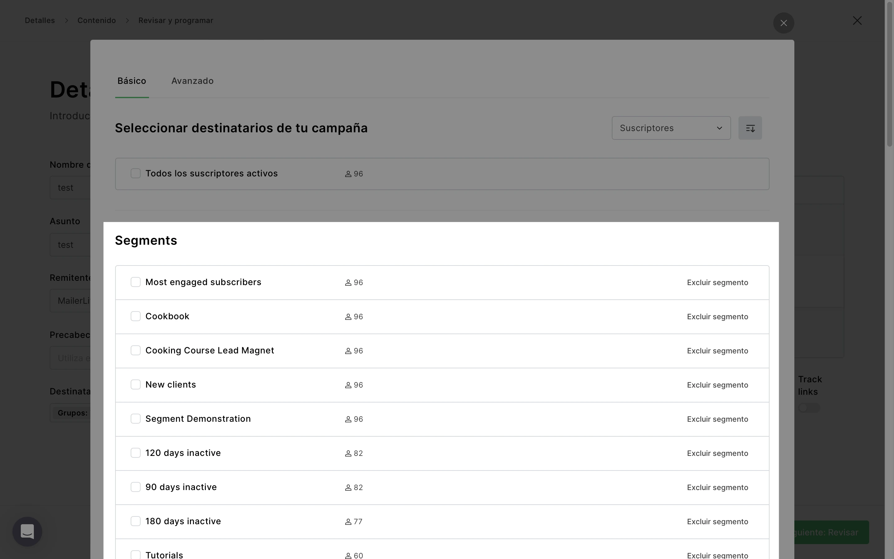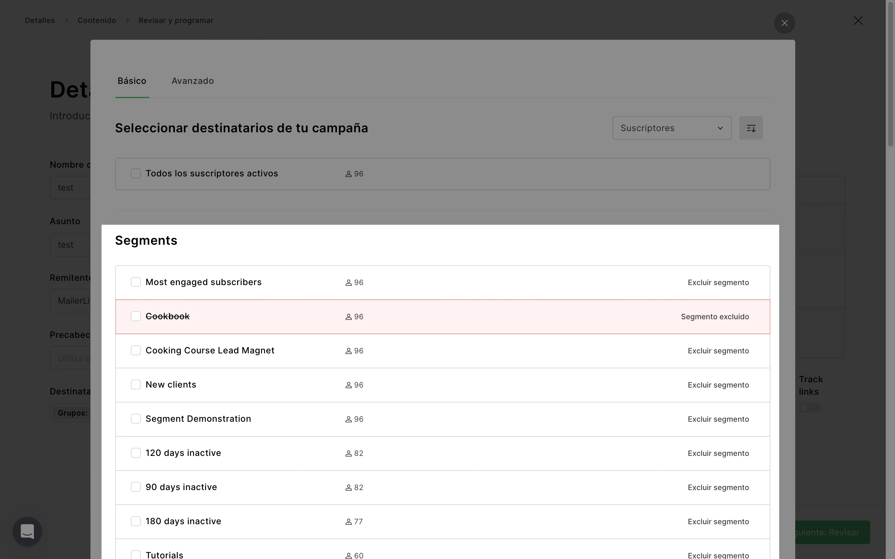 Los segmentos se pueden utilizar como destinatarios de cualquier campaña. También se pueden excluir de cualquier campaña si el segmento contiene suscriptores que deseas que no reciban un newsletter en particular.