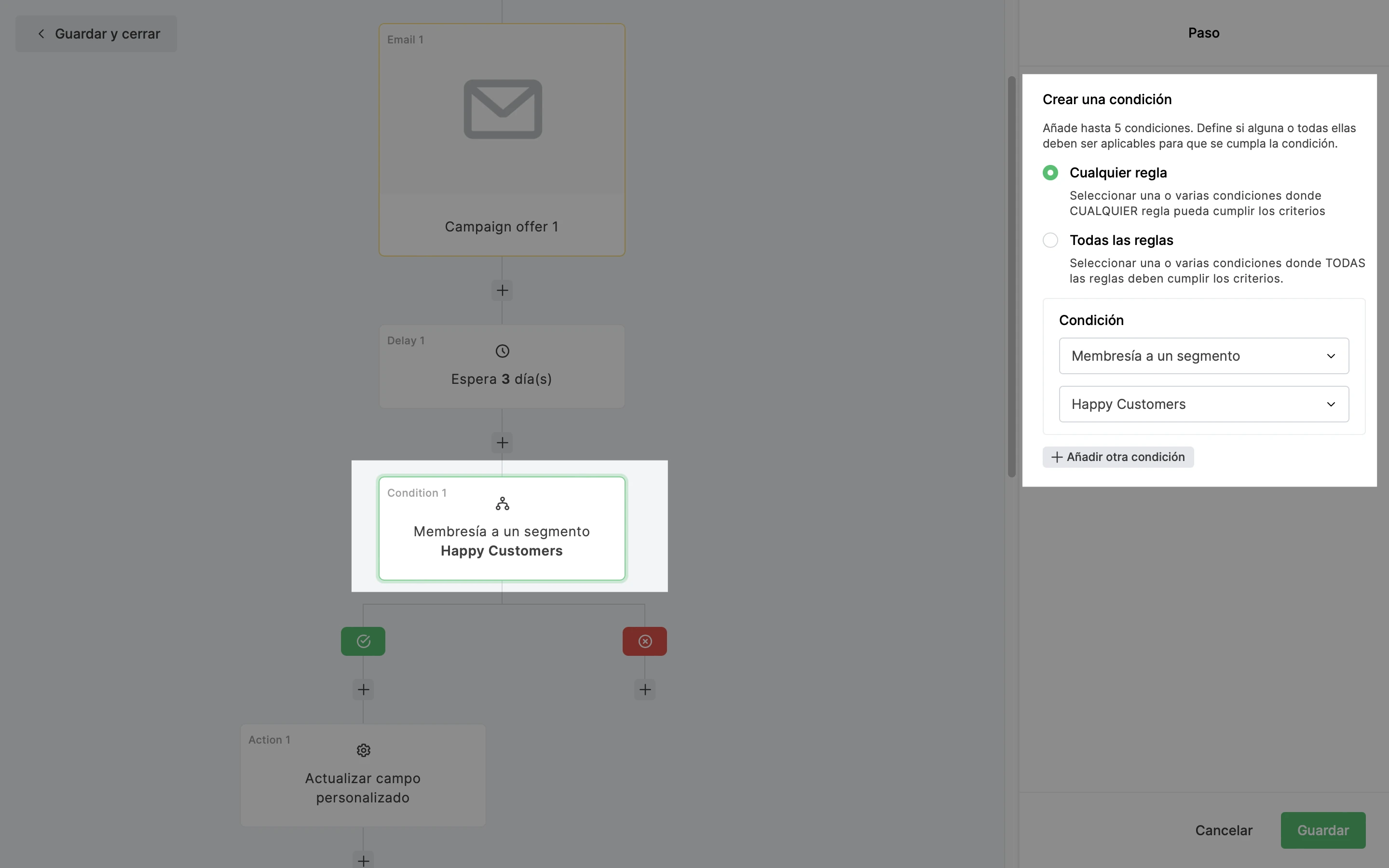 Si tienes establecida la condición 1 y la condición 2, los suscriptores deben cumplir ambas condiciones para ser incluidos en el segmento.