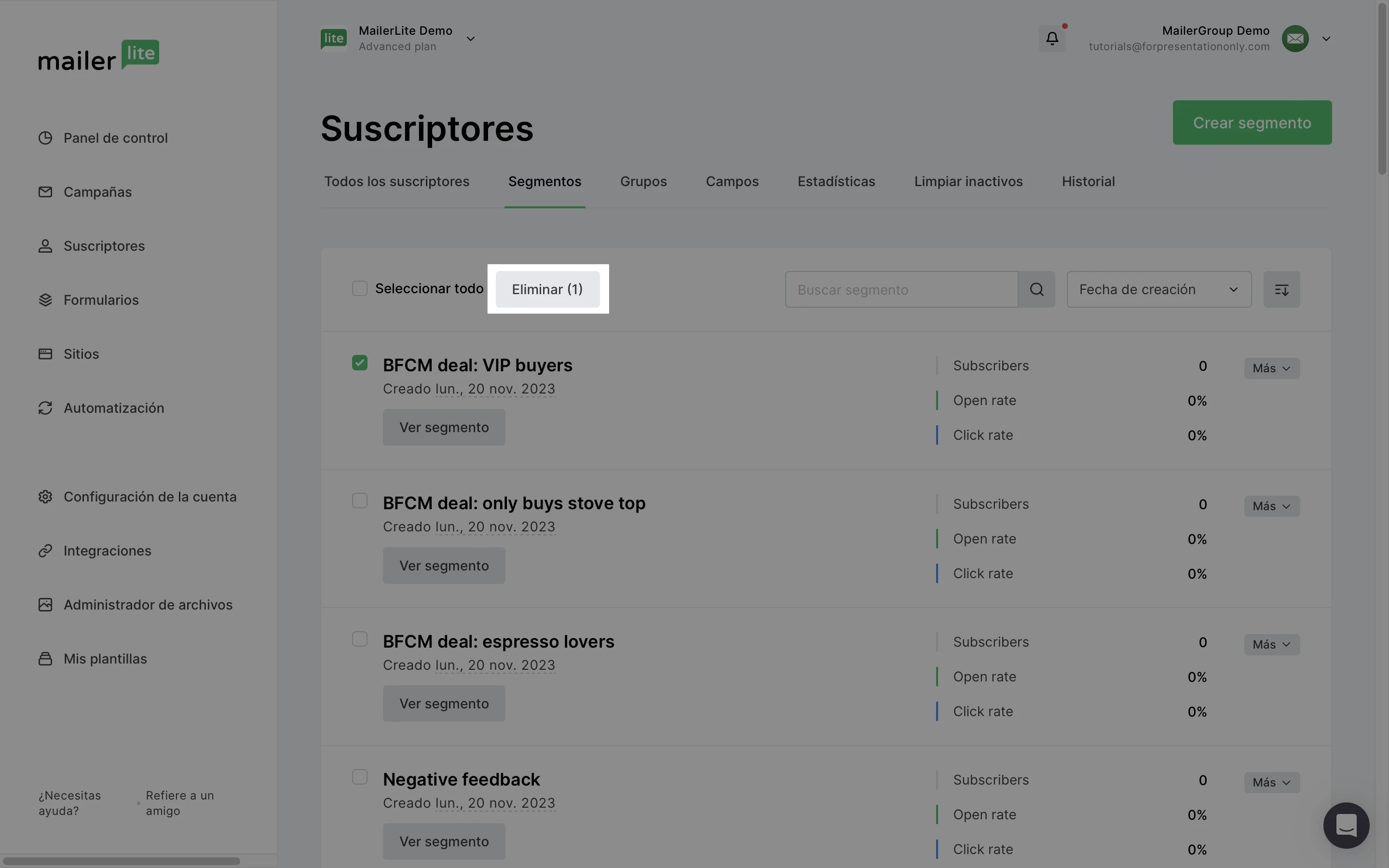 Nota: Eliminar un segmento solo eliminará el segmento en sí, no los suscriptores dentro de él.