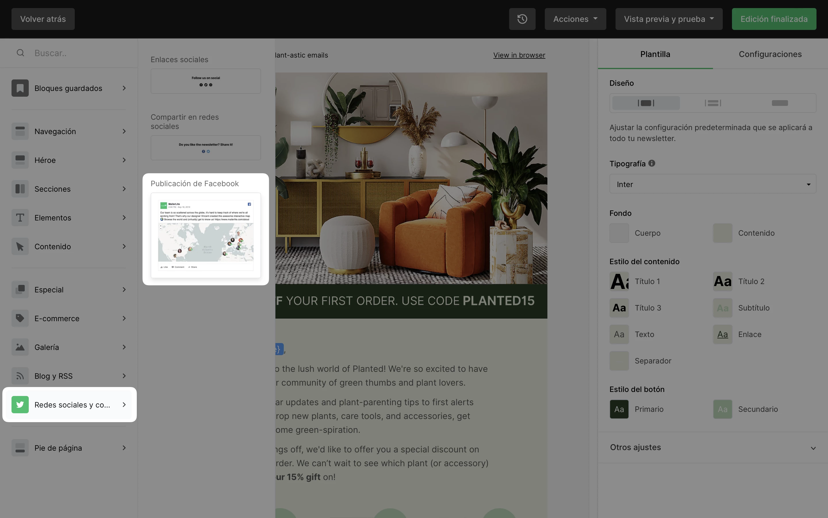 En la pestaña Redes sociales y compartir, arrastra y suelta la publicación o el bloque de Facebook en tu newsletter.