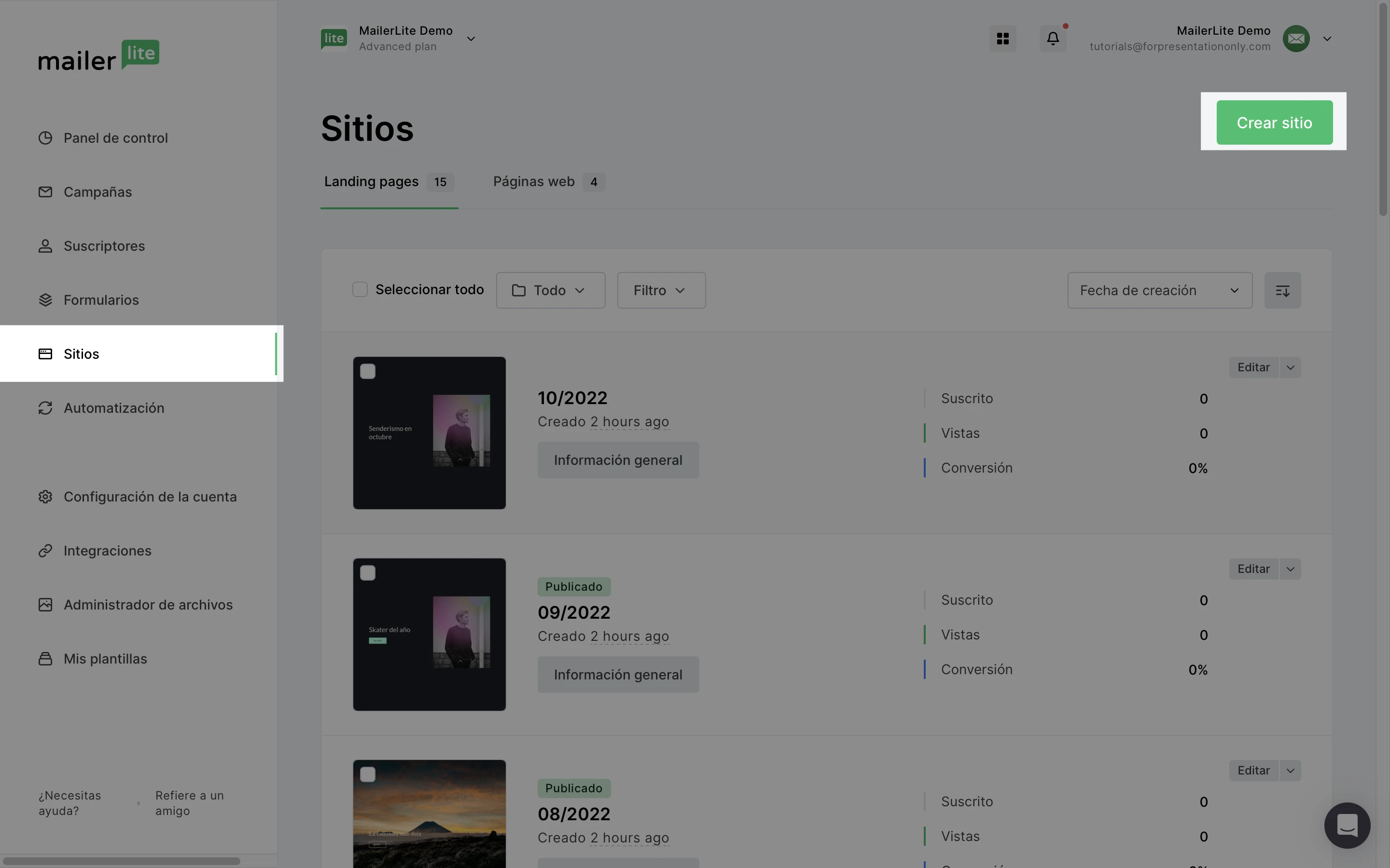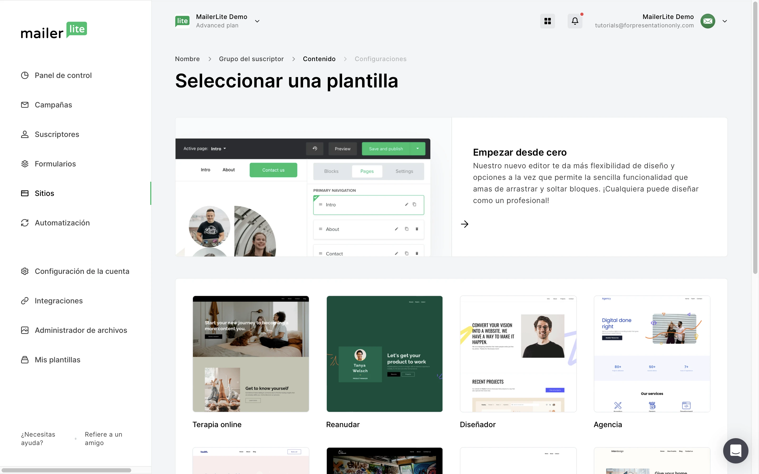 Todas las cuentas de MailerLite pueden crear y publicar un sitio web de hasta cinco páginas utilizando nuestro creador de sitios web. Las cuentas gratuitas están limitadas a una sola, mientras que las cuentas bajo el plan Negocio en Crecimiento o Avanzado tienen sitios web ilimitados.