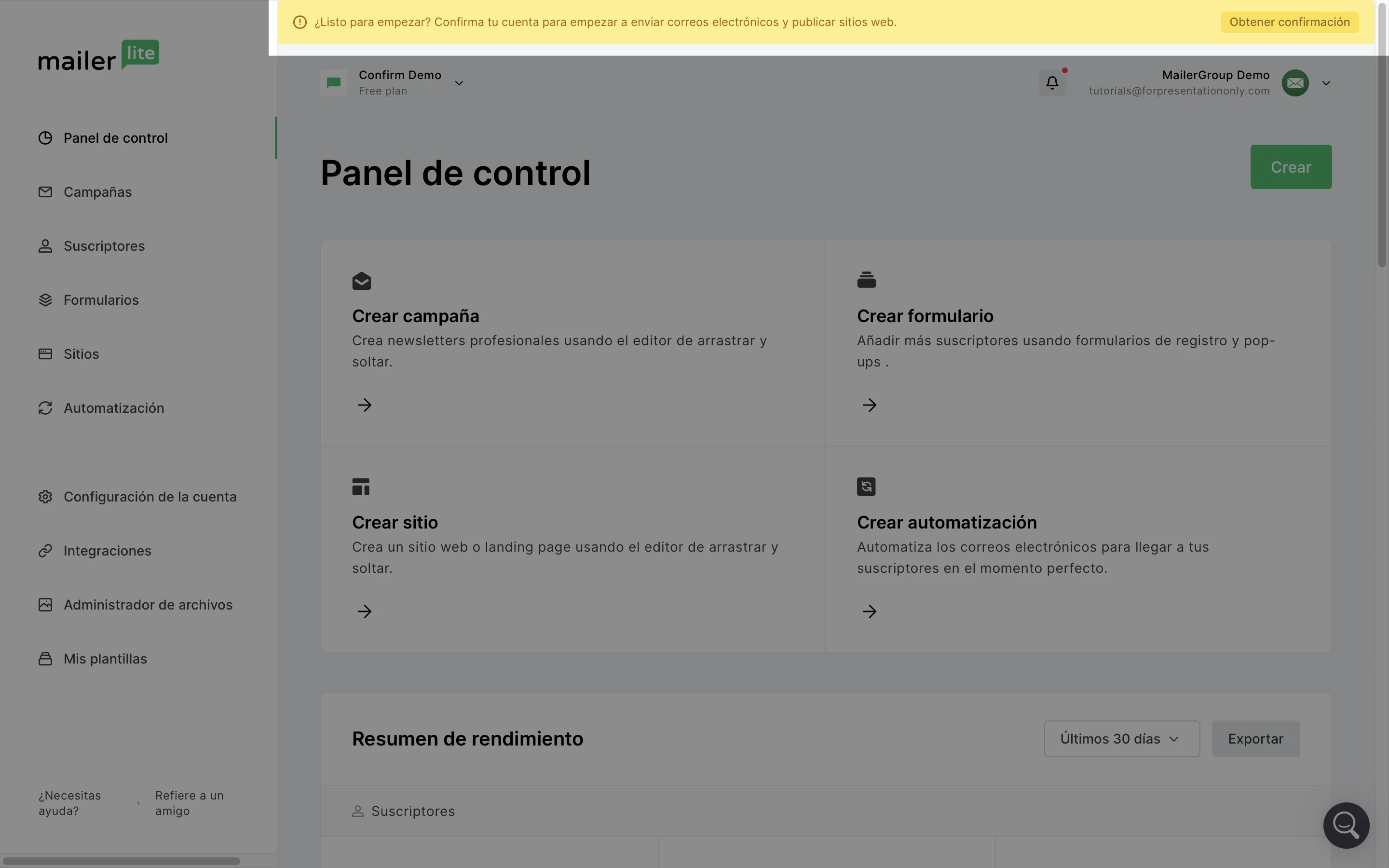 Una vez creada tu cuenta, puedes empezar a probar las funciones de MailerLite. Sin embargo, no podrás enviar una campaña o publicar un sitio hasta que tu cuenta haya sido confirmada por MailerLite. Esto significa que para empezar a enviar campañas por correo electrónico, habilitar flujos de trabajo de automatización, publicar sitios y contactar con nuestro equipo de asistencia por chat en directo 24/7, primero debes confirmar tu cuenta.