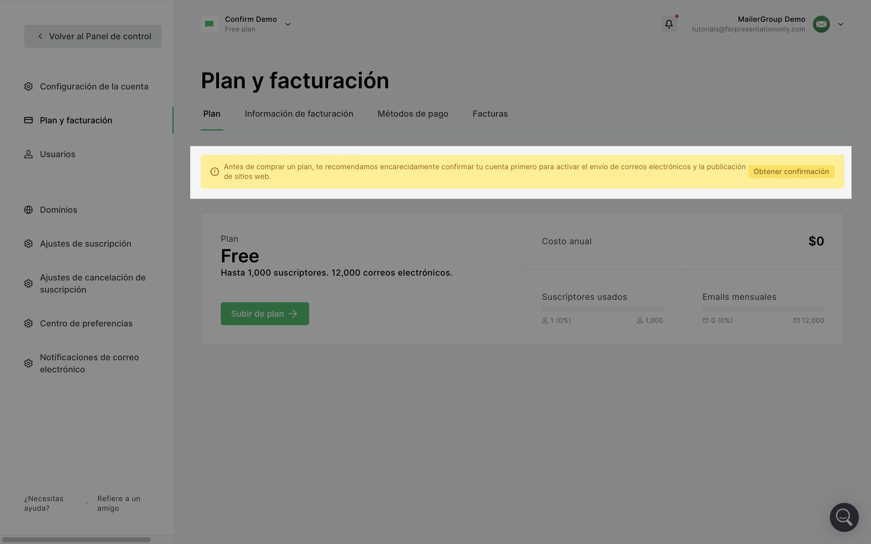 Si tu cuenta aún no está confirmada, verás una opción para confirmarla desde el Panel de control de MailerLite, así como en la sección Plan y facturación.