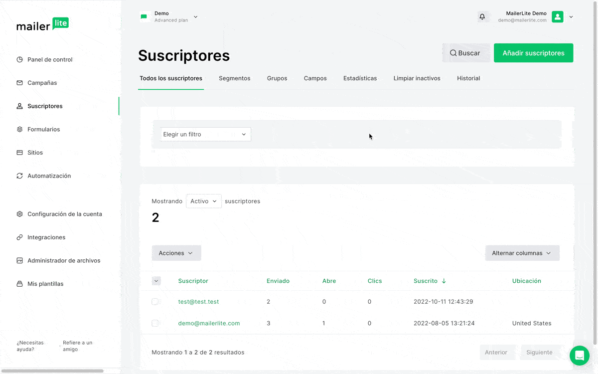 Una vez que hayas revisado tu importación, puedes dirigirte a la página Suscriptores y encontrar que los suscriptores se han agregado correctamente.
