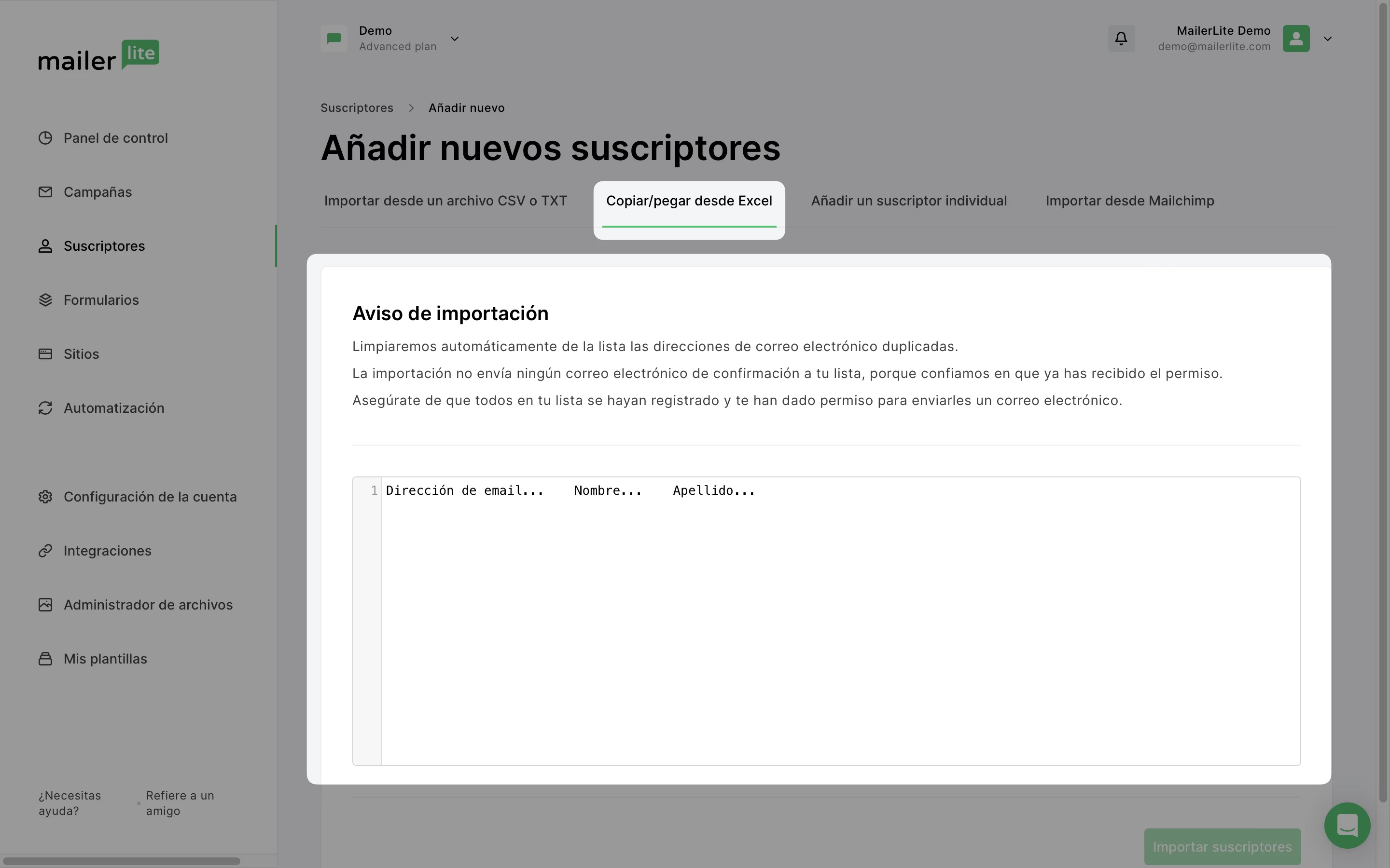 El archivo comenzará a importarse y, una vez finalizado el proceso, se te notificará cuántos suscriptores se agregaron correctamente y cuántos fallaron (si los hay).