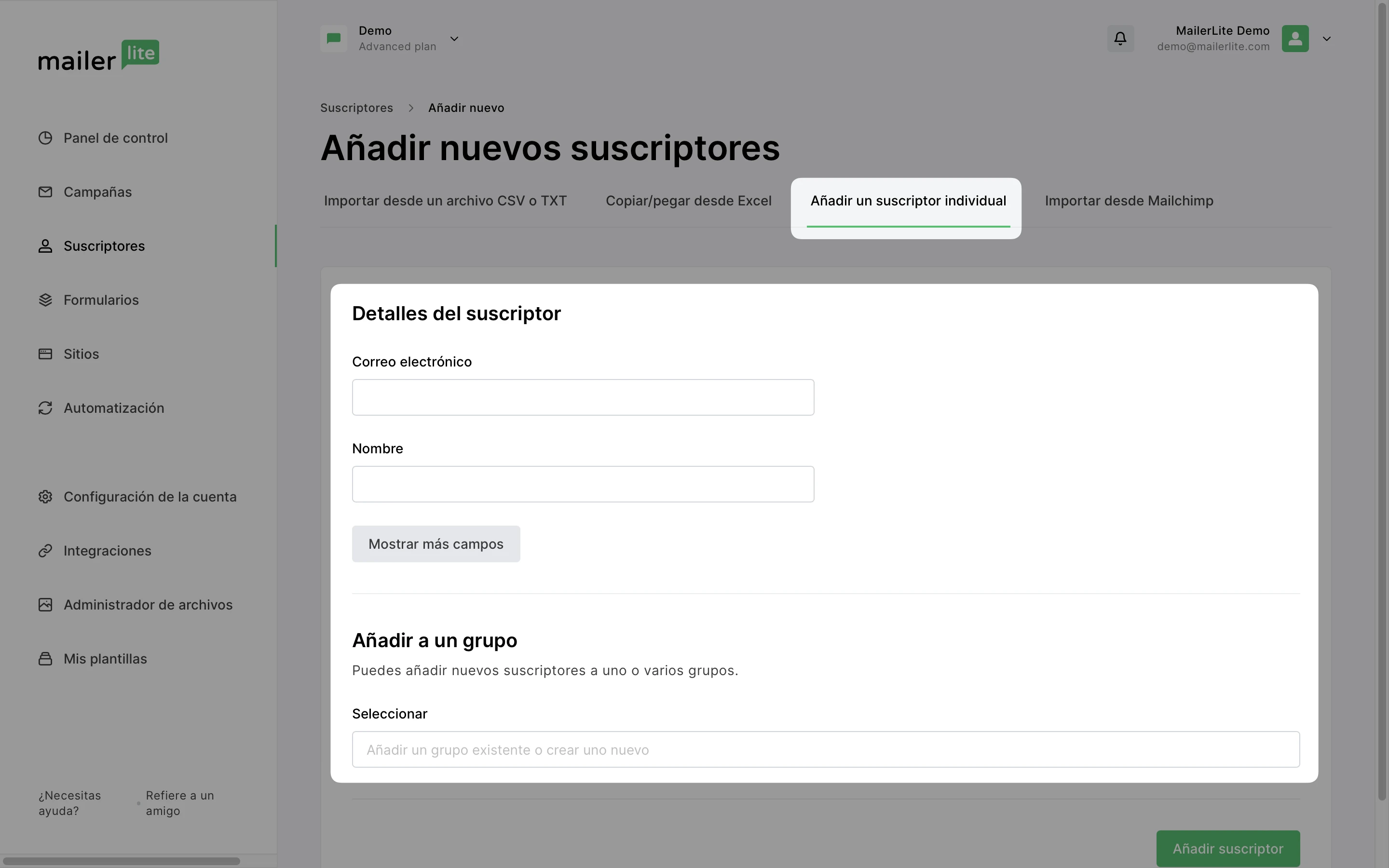 Si deseas agregar un solo suscriptor, debes enviar manualmente los datos del suscriptor.