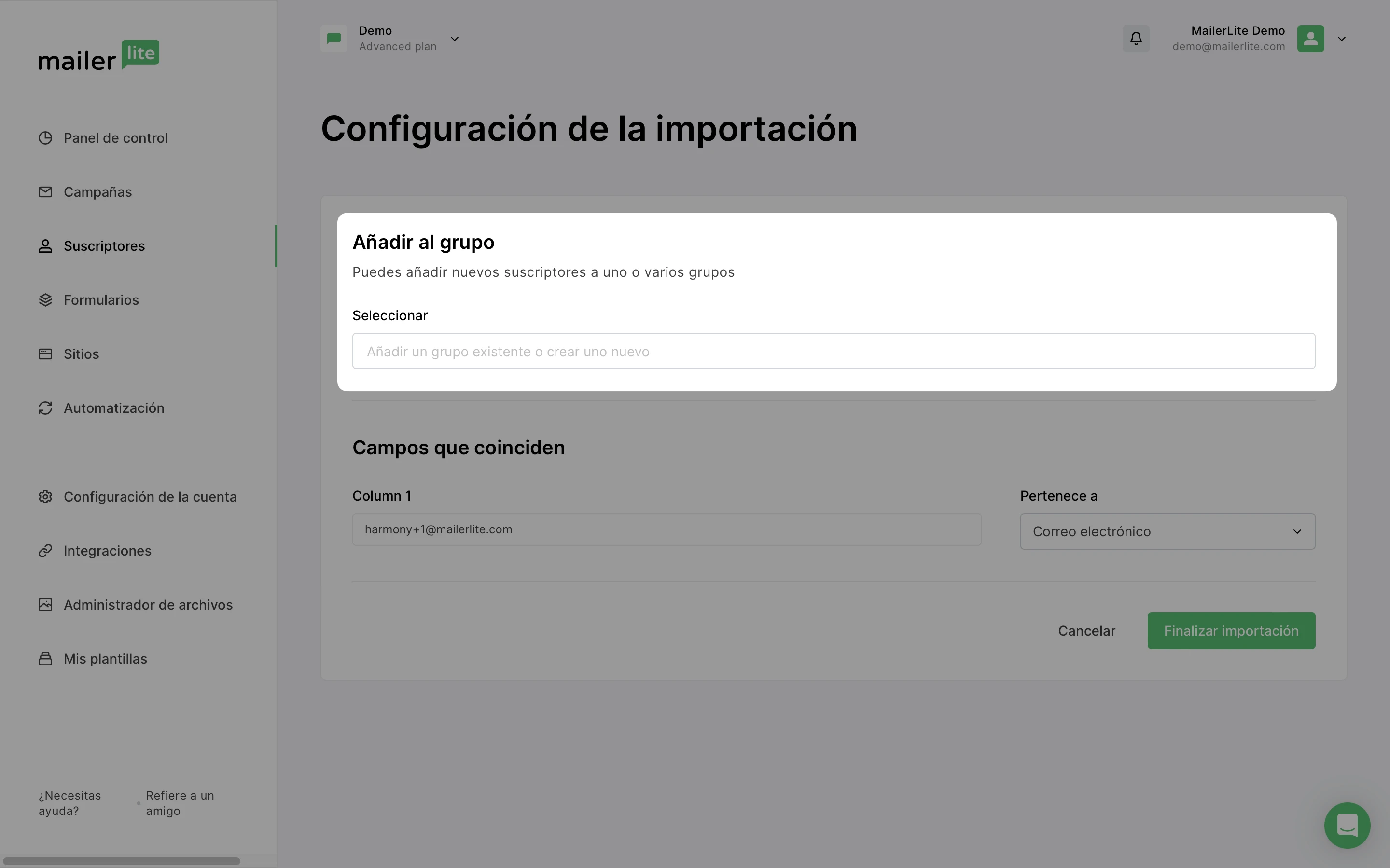 Procederás a elegir a qué grupo(s) añadir tus suscriptores, y a hacer coincidir las columnas de tu hoja de cálculo con los campos de tu lista de suscriptores de MailerLite, si es necesario.