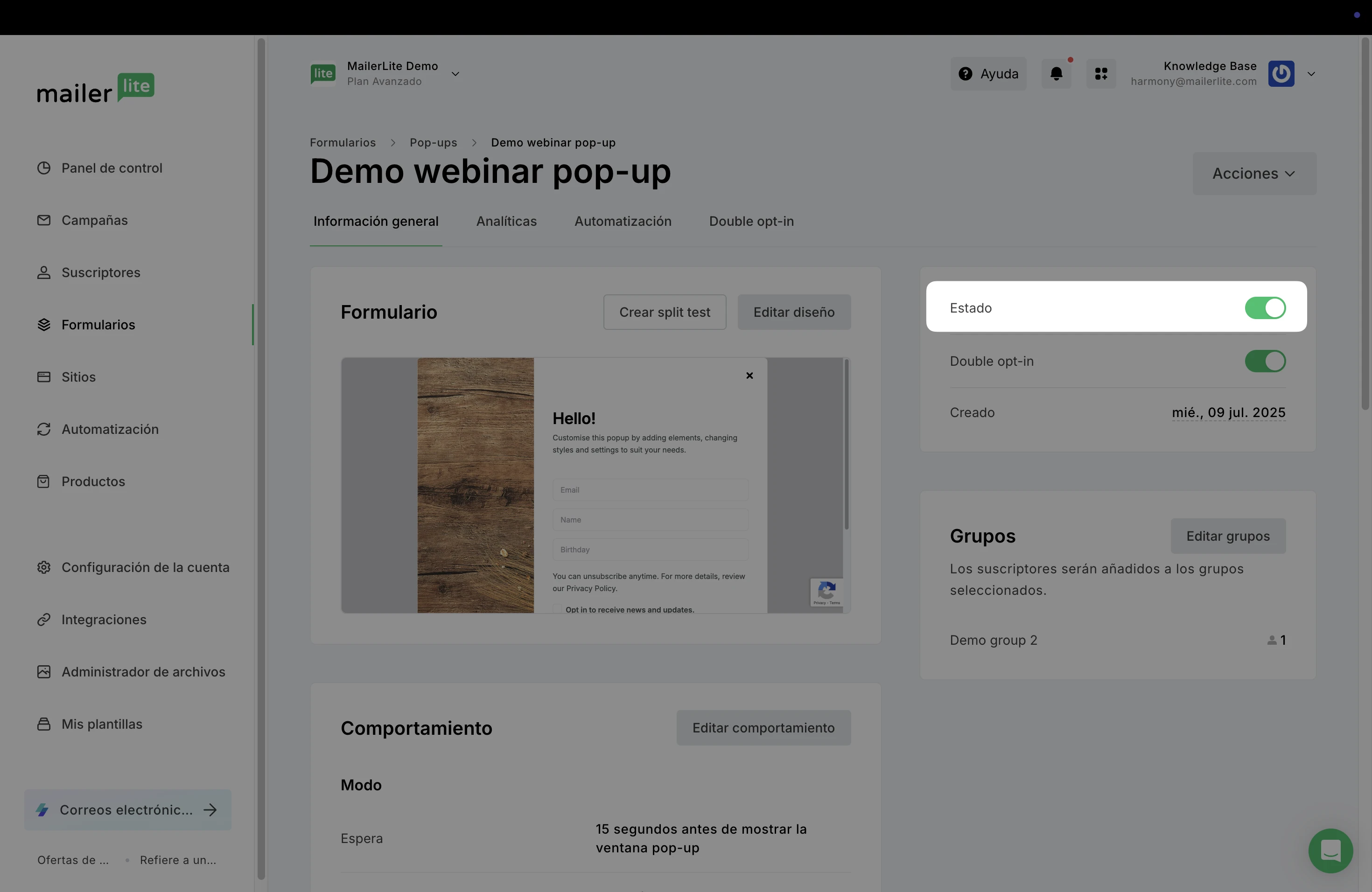 Para añadir un formulario pop-up de MailerLite a tu sitio Wix, asegúrate de crear primero el formulario en tu cuenta MailerLite, y que el Estado esté ACTIVADO.