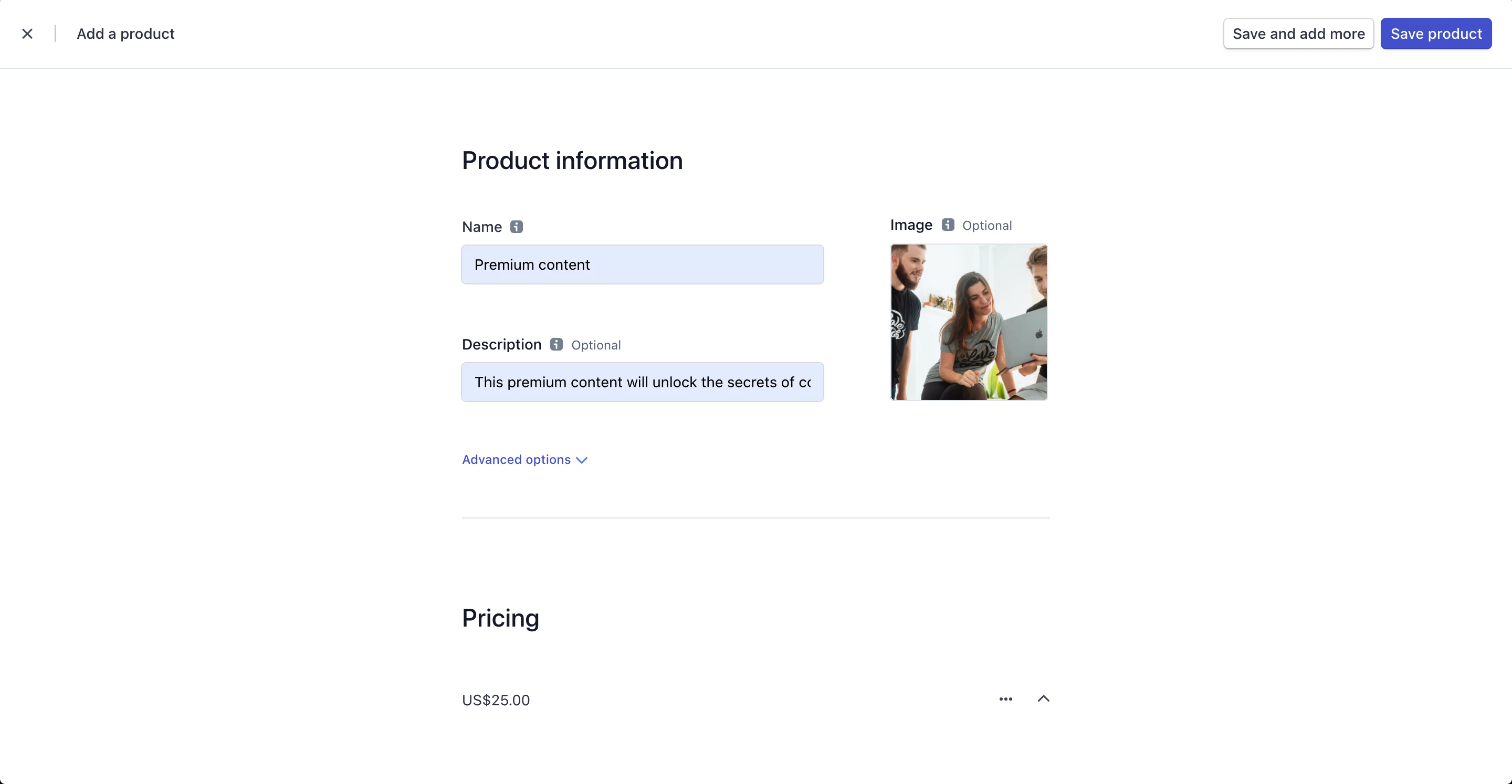 3. En Información del producto, agrega un Nombre, Descripción y una Imagen para tu producto. Esta información llenará el bloque de productos de Stripe en MailerLite y sólo se podrá editar en Stripe. Los nombres, las descripciones y las imágenes de los productos no se pueden modificar en MailerLite.