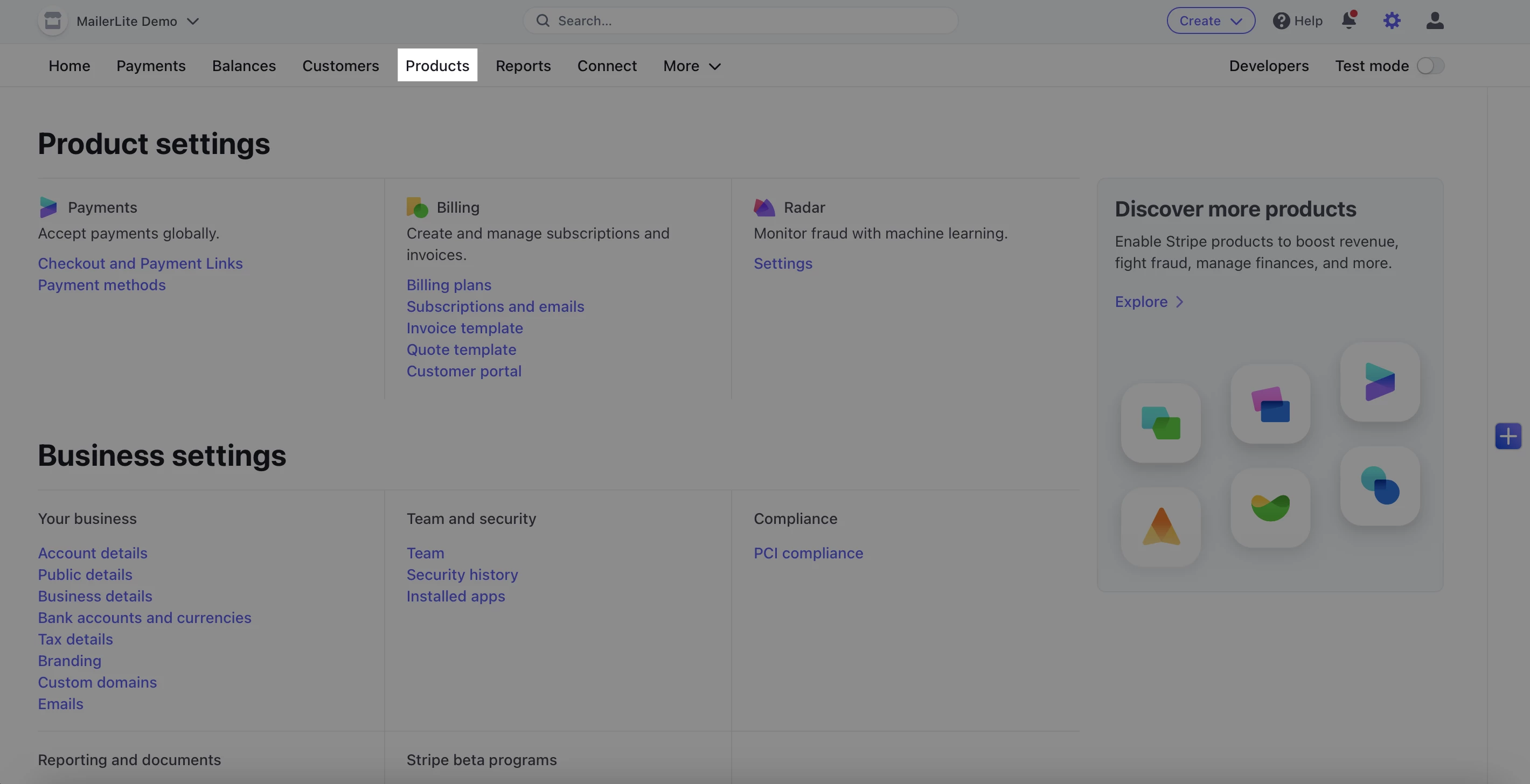 Una vez que hayas configurado tus bloques de Stripe y creado tus productos en Stripe, te recomendamos ajustar algunas configuraciones en Stripe.