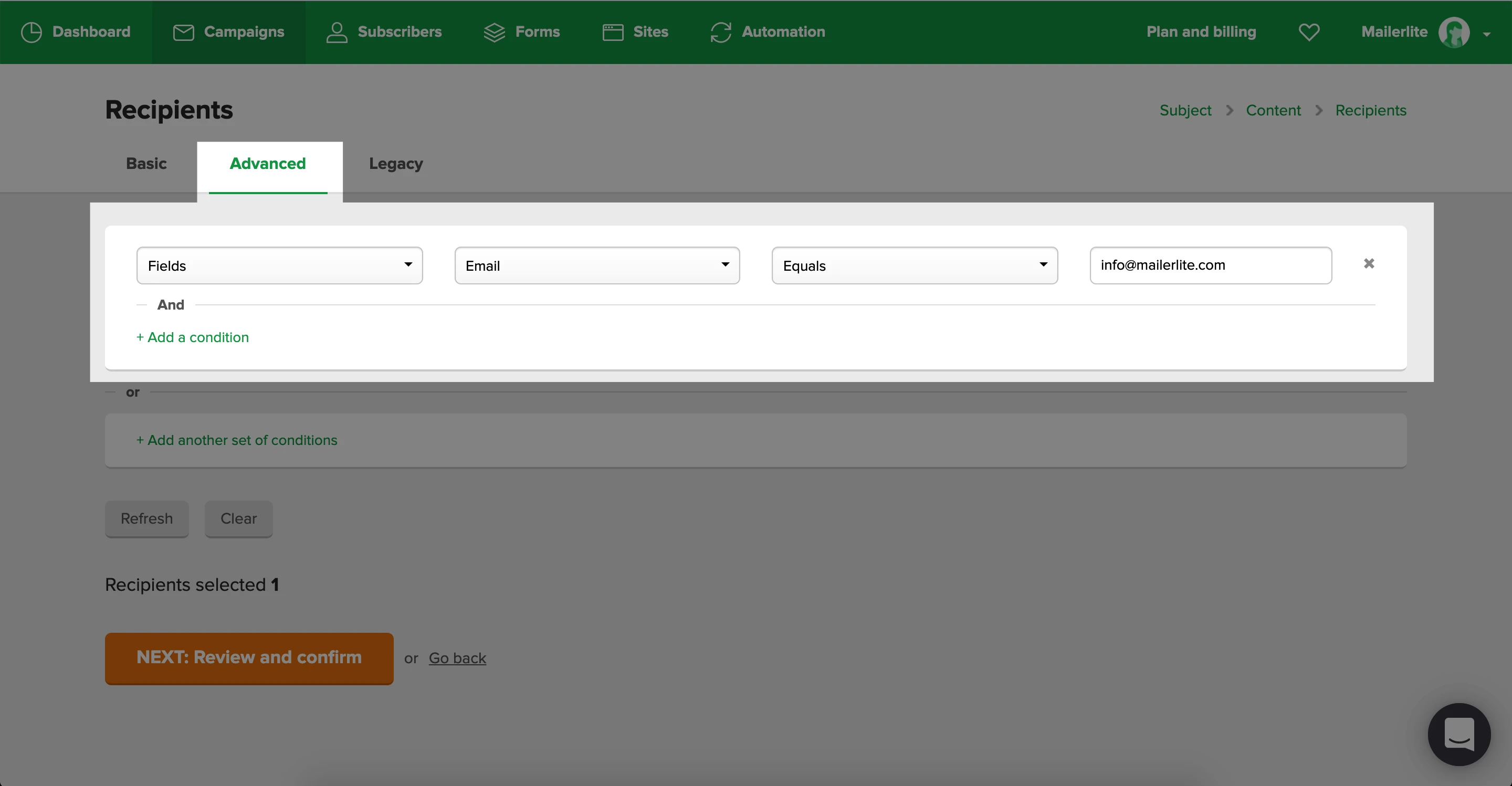 Note: You can also create a group where you can add the single recipient. Then select this group as the sole recipient of the campaign.