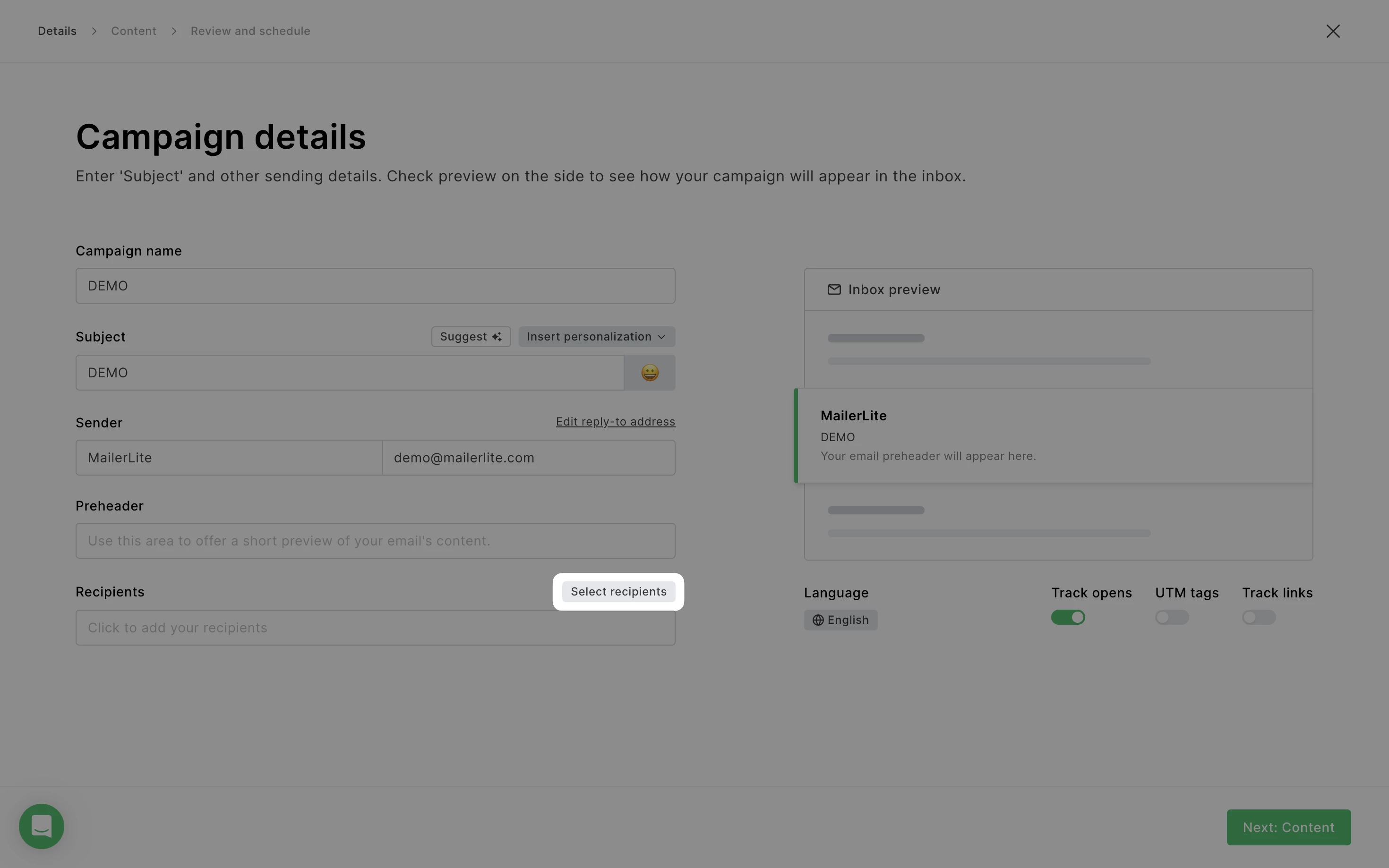 Head to the Recipients step of the campaign