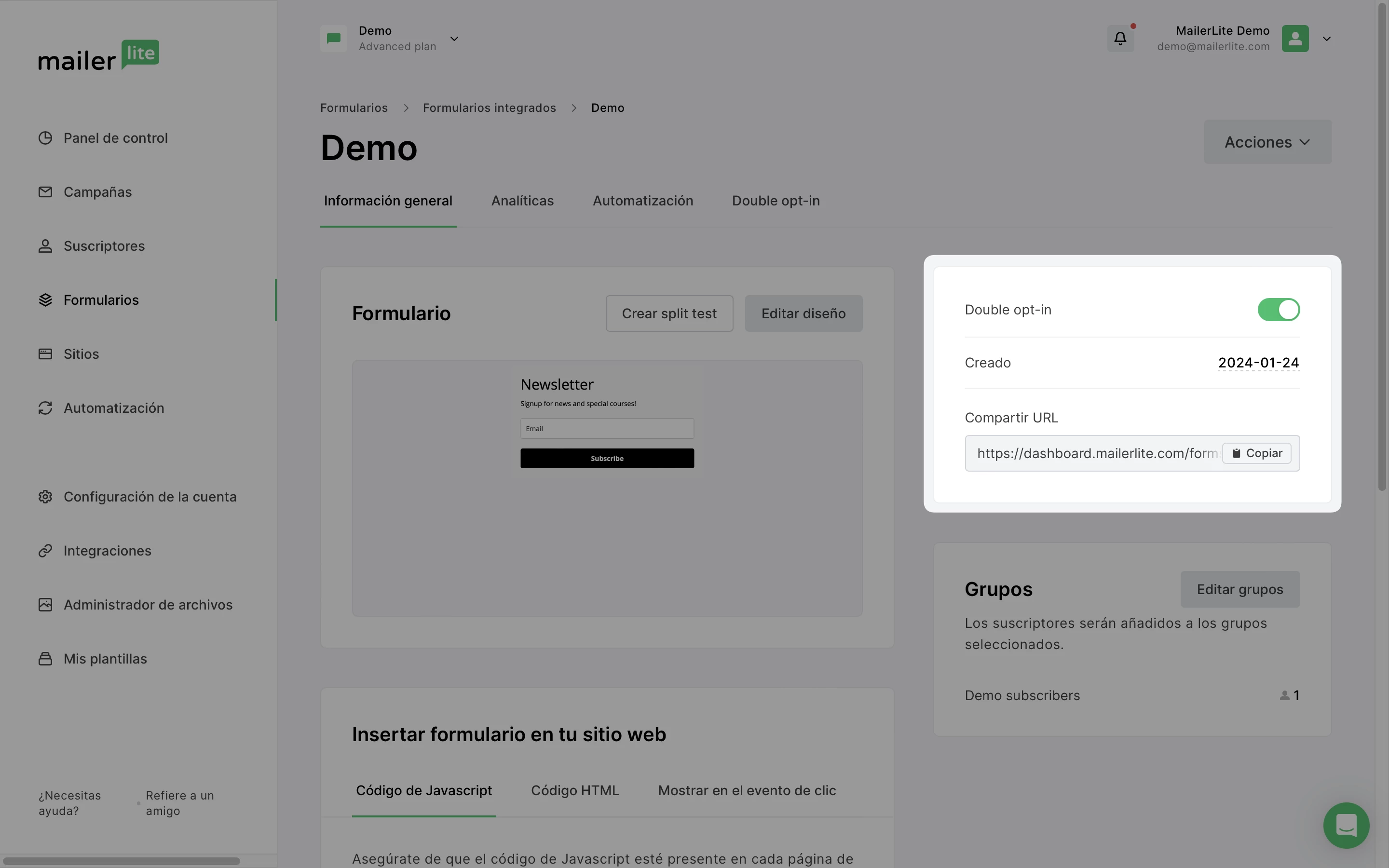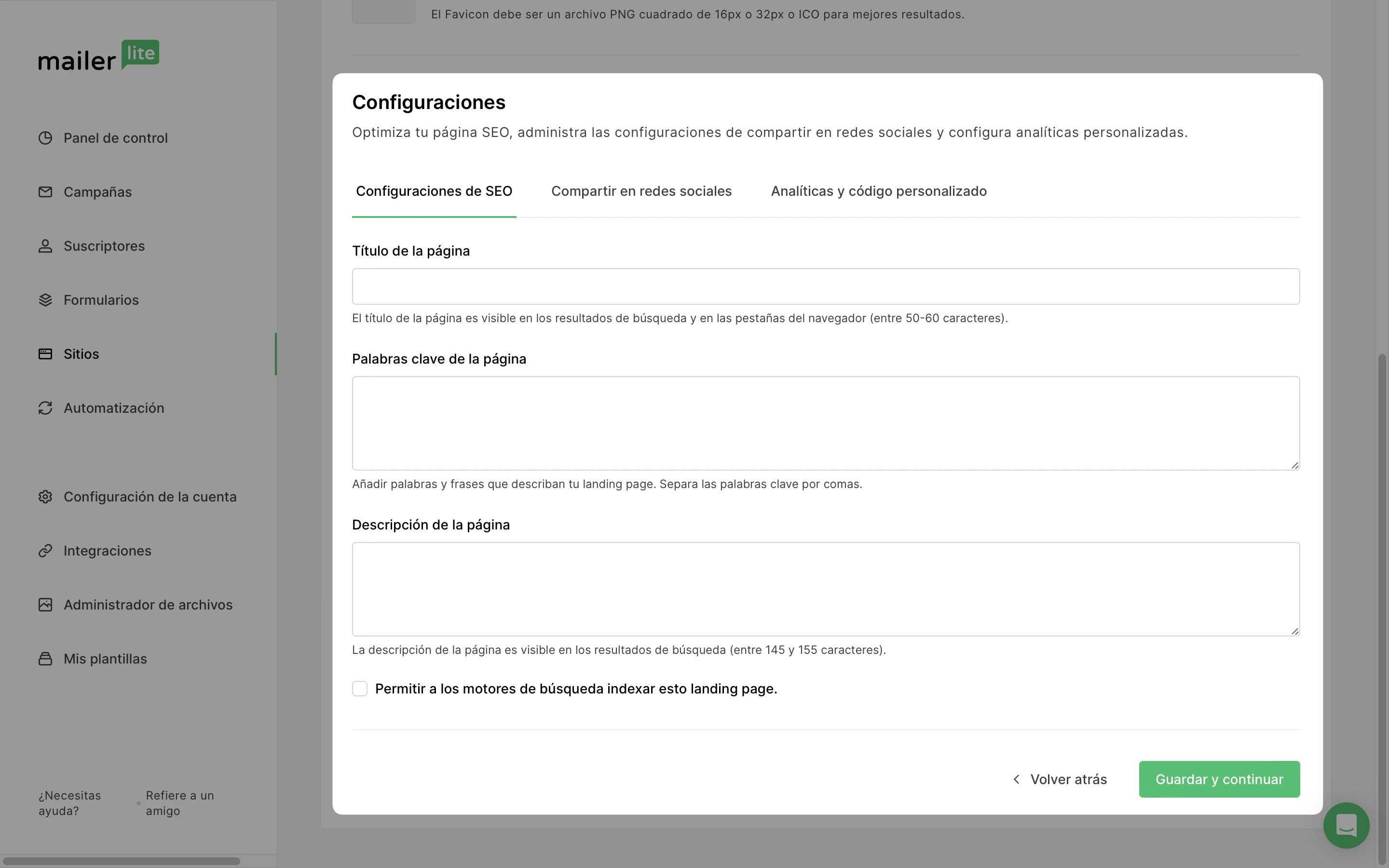 En MailerLite, puedes añadir tanto el número como el código del píxel de seguimiento.