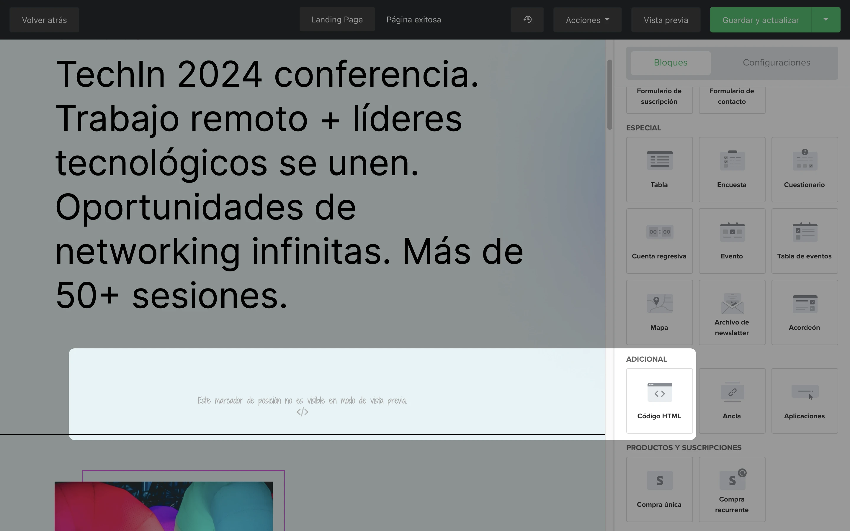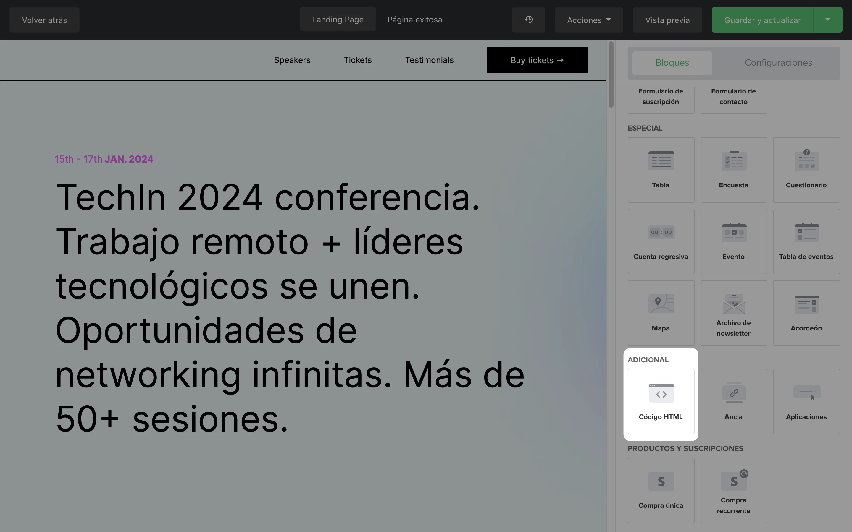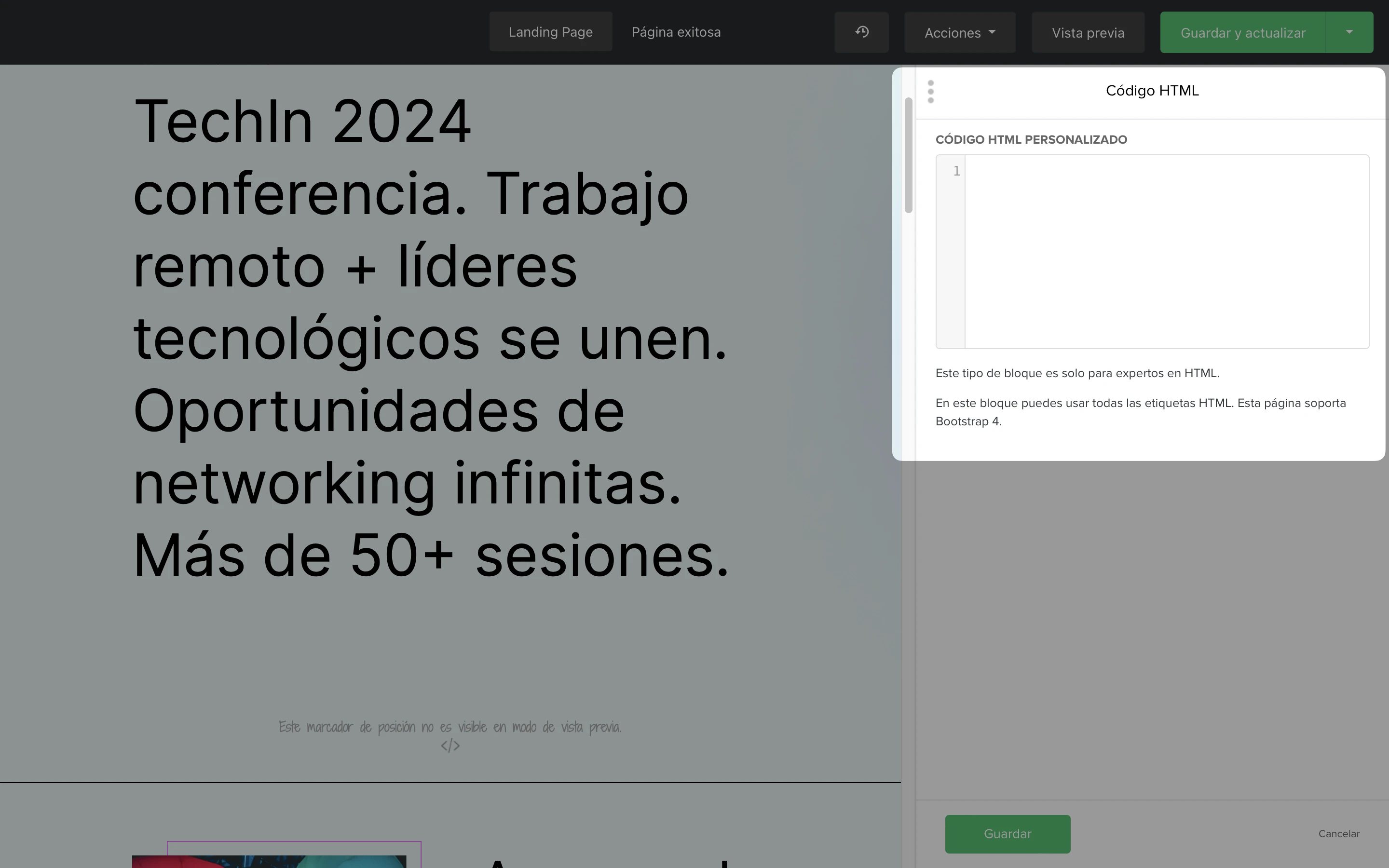 Añade el código del píxel de Facebook en un bloque de código HTML tanto en la landing page como en la página de confirmación.