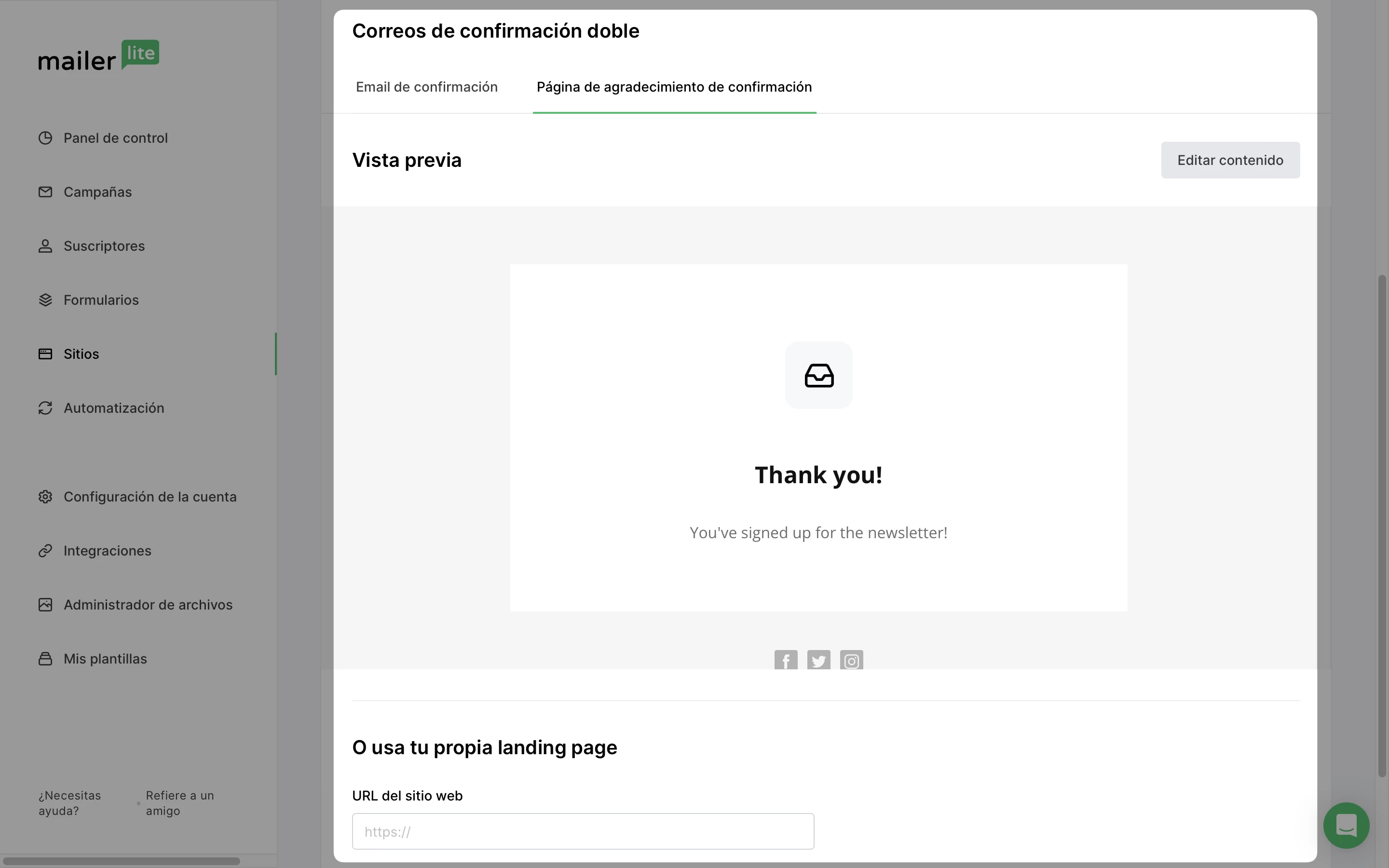 Activa el doble opt-in e inserta el código del píxel de Facebook en una página de confirmación personalizada. De esta forma, sólo los que confirmen su suscripción serán redirigidos a esta página personalizada. Para ello, dirígete a la pestaña Doble opt-in de la landing page, selecciona la pestaña página de confirmación y desplázate hasta la sección URL del sitio web.