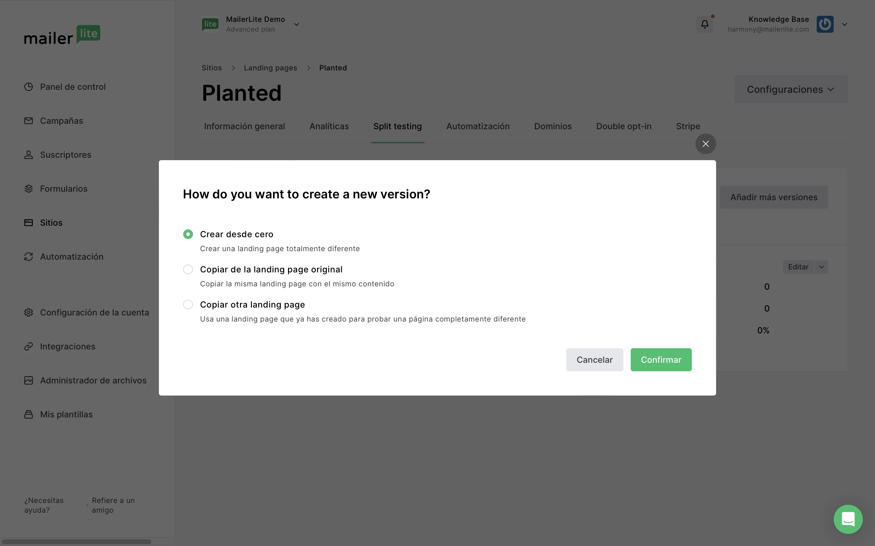 Copiar de la landing page original - Crear la versión B a partir de una copia de la versión A (ideal si sólo deseas hacer cambios pequeños).