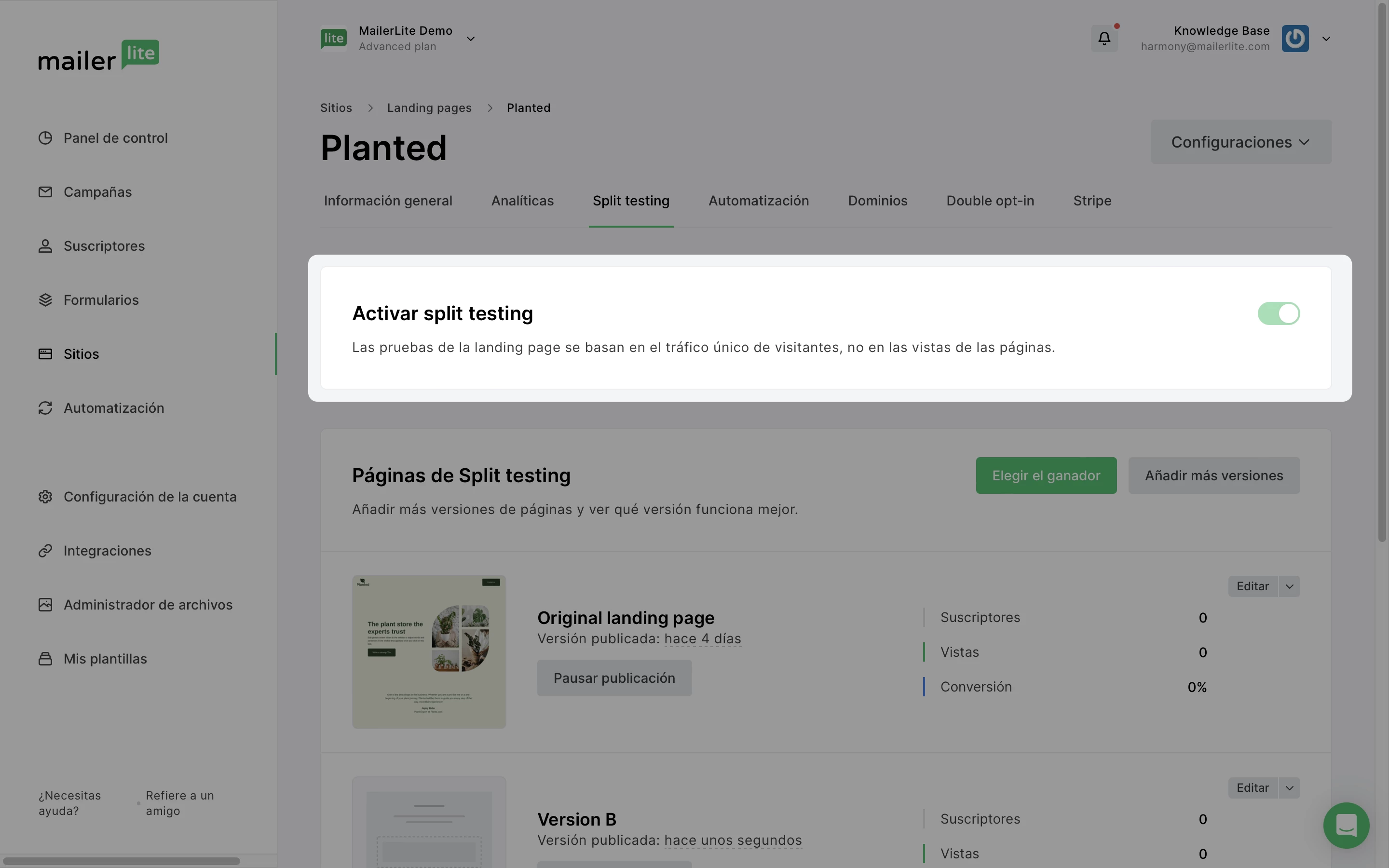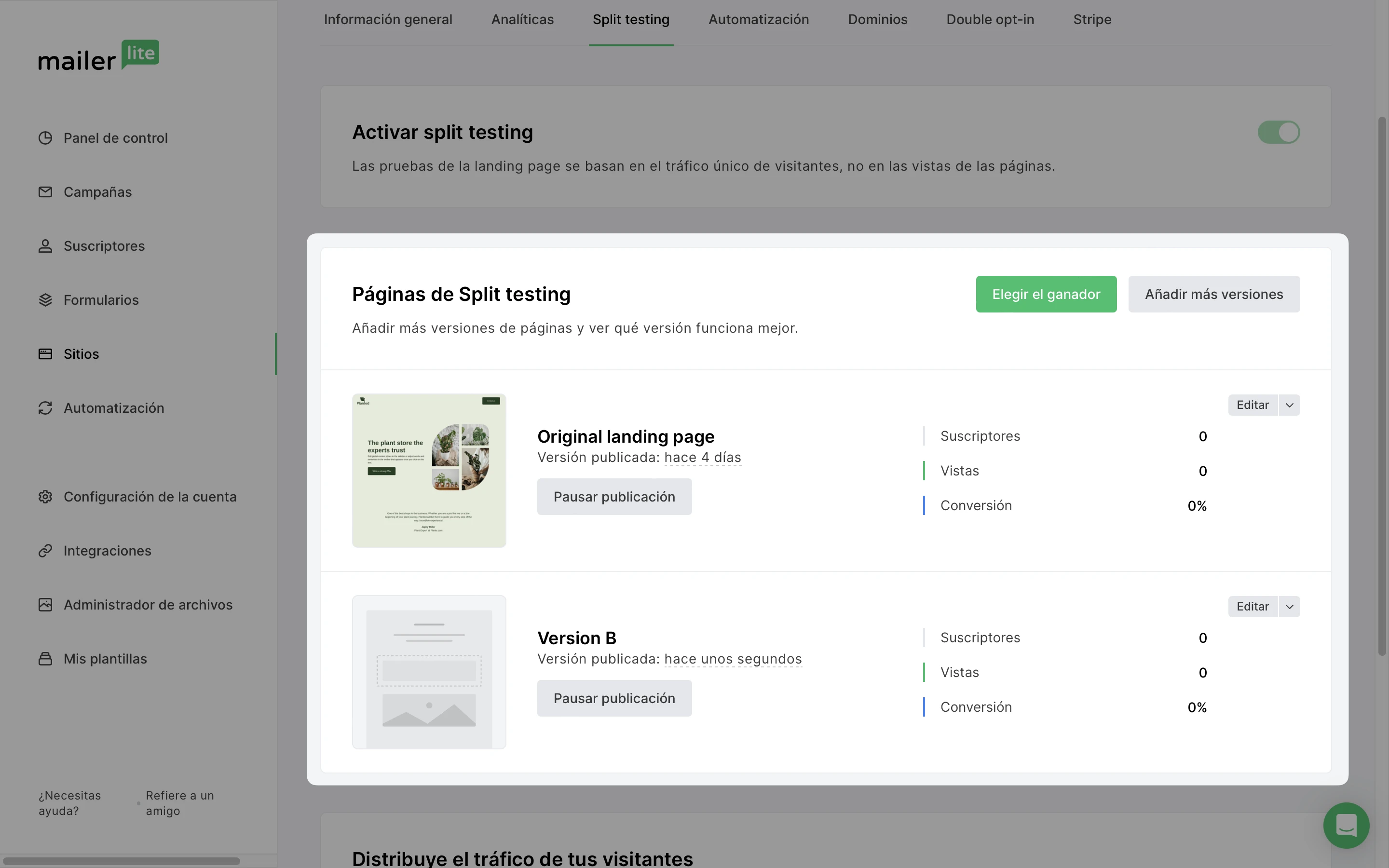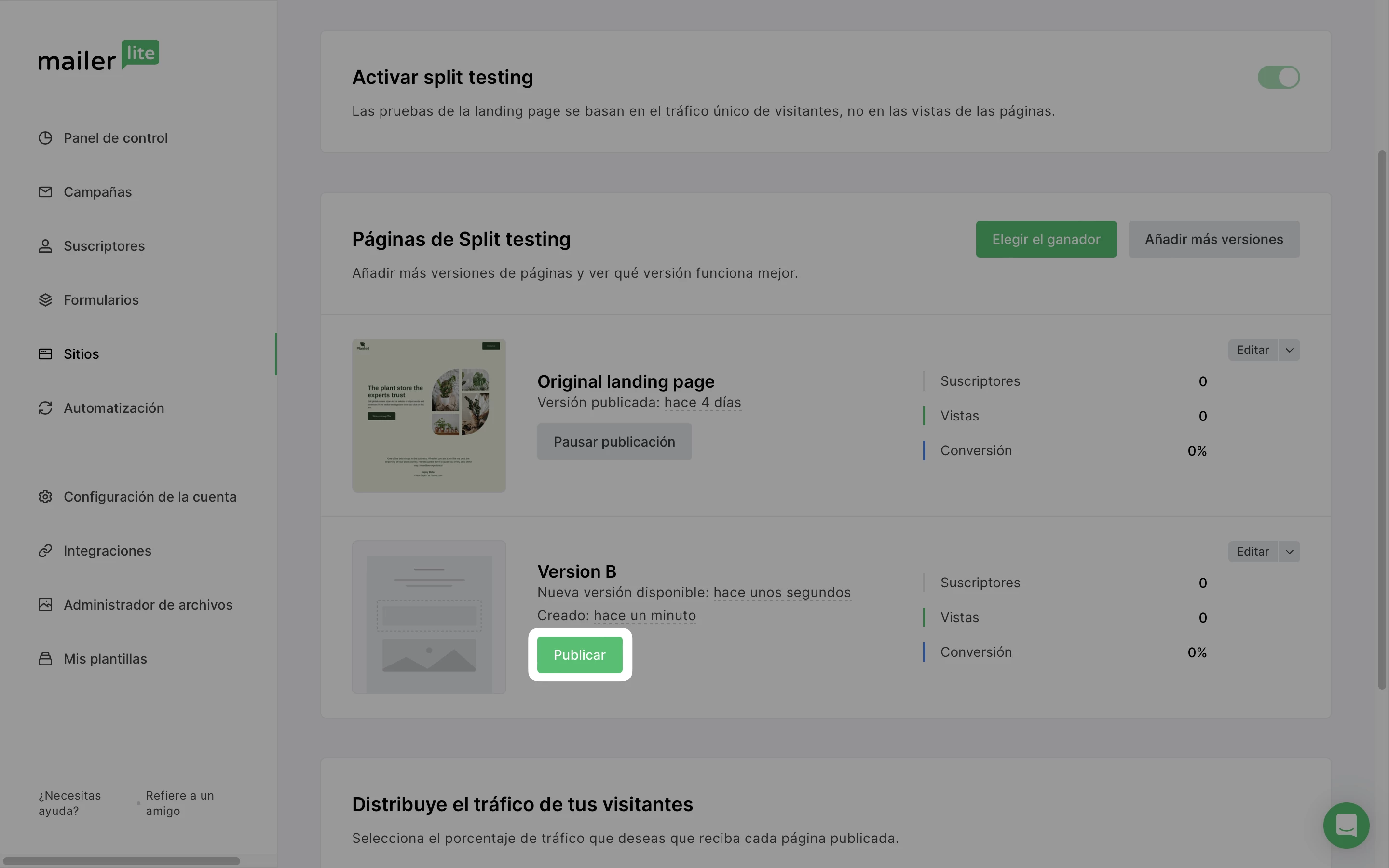 En Páginas de pruebas A/B, verás la opción de publicar/despublicar las distintas versiones de la prueba A/B, elige el ganador y añade más versiones a la prueba.