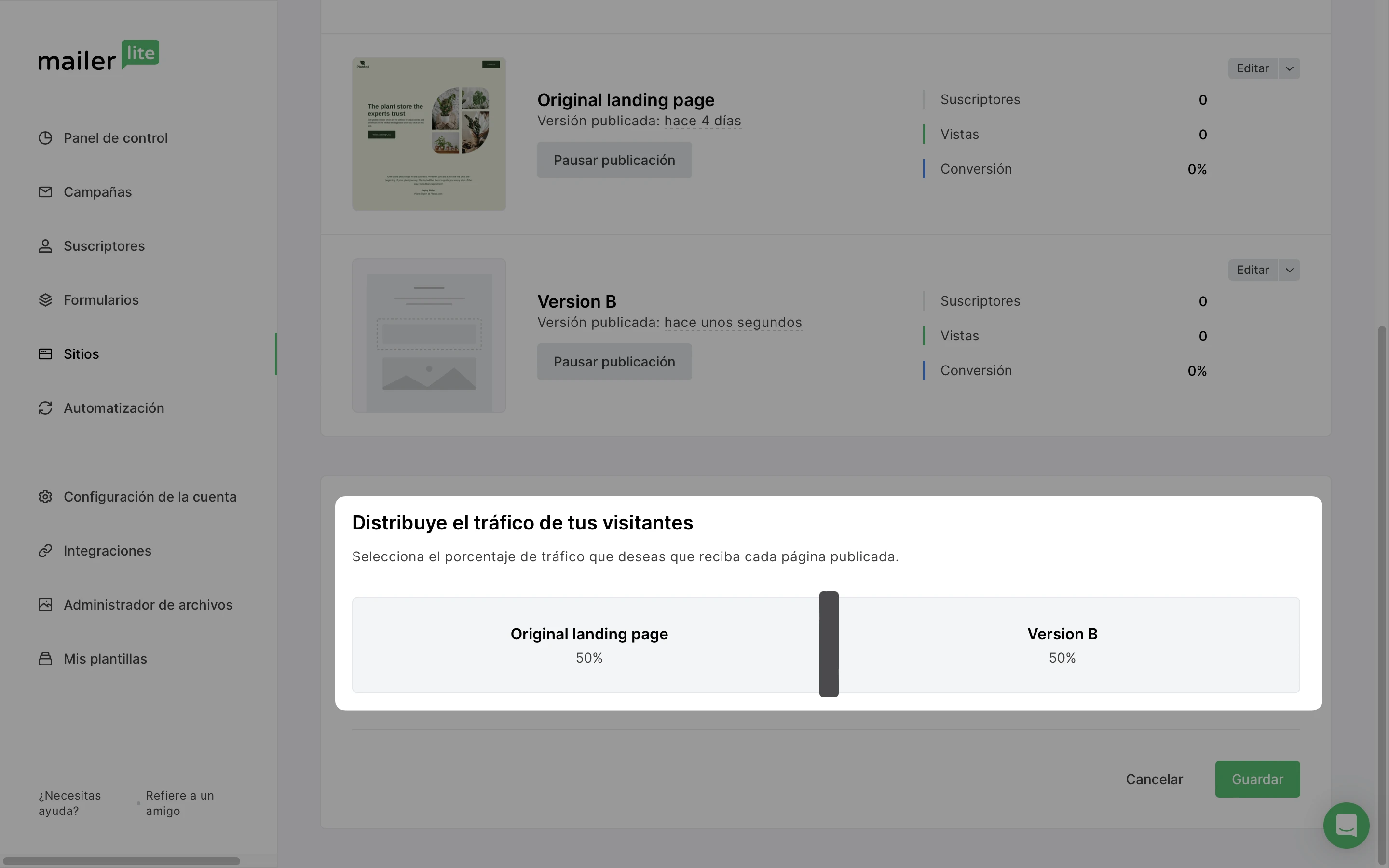 3. En Distribuir el tráfico de visitantes, puedes arrastrar el divisor para seleccionar el porcentaje de tráfico que quieres dirigir a cada versión. Por defecto, el tráfico se distribuirá a partes iguales entre las versiones.