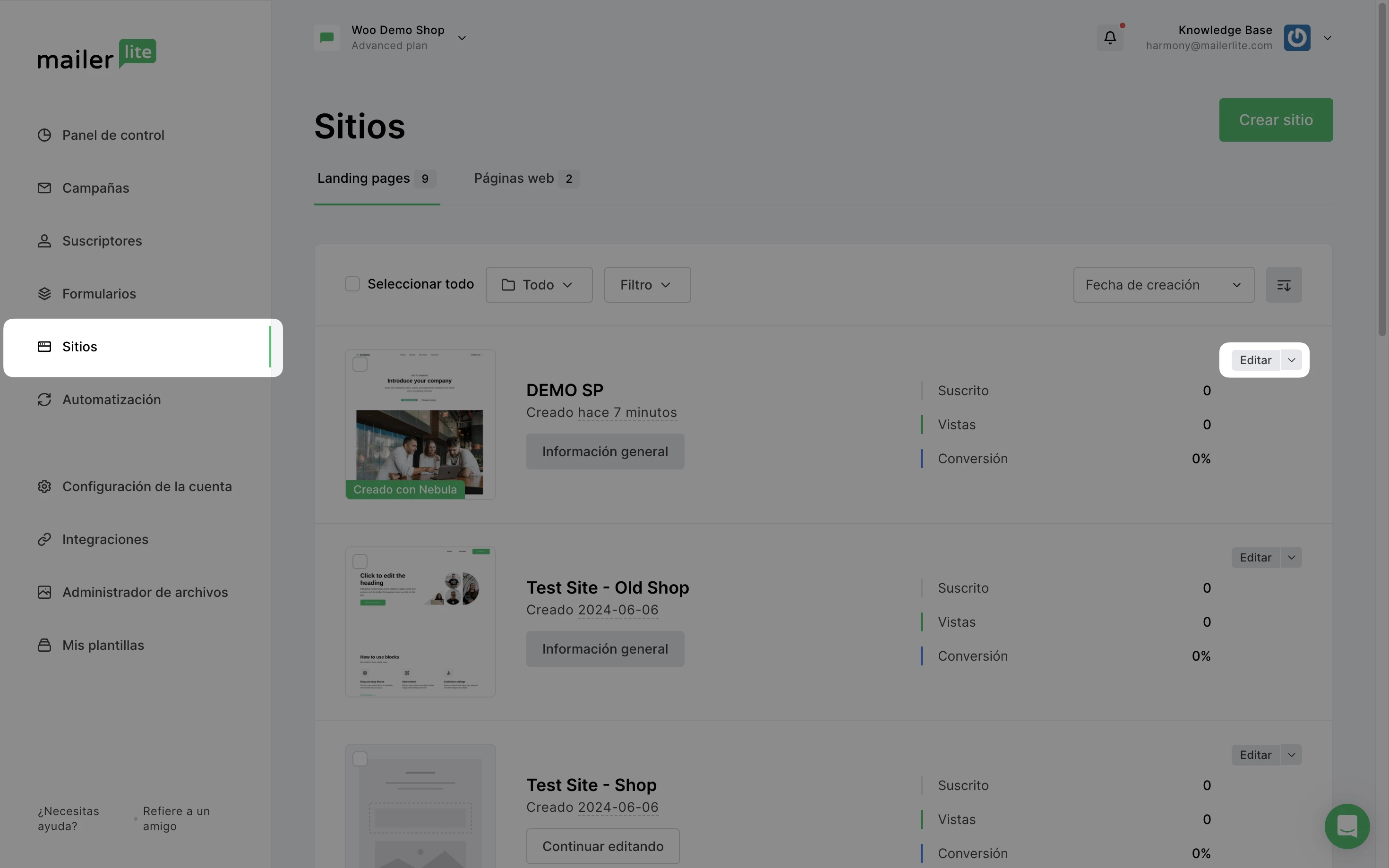 Busca tu landing page y haz clic en Editar para abrir el editor de arrastrar y soltar.