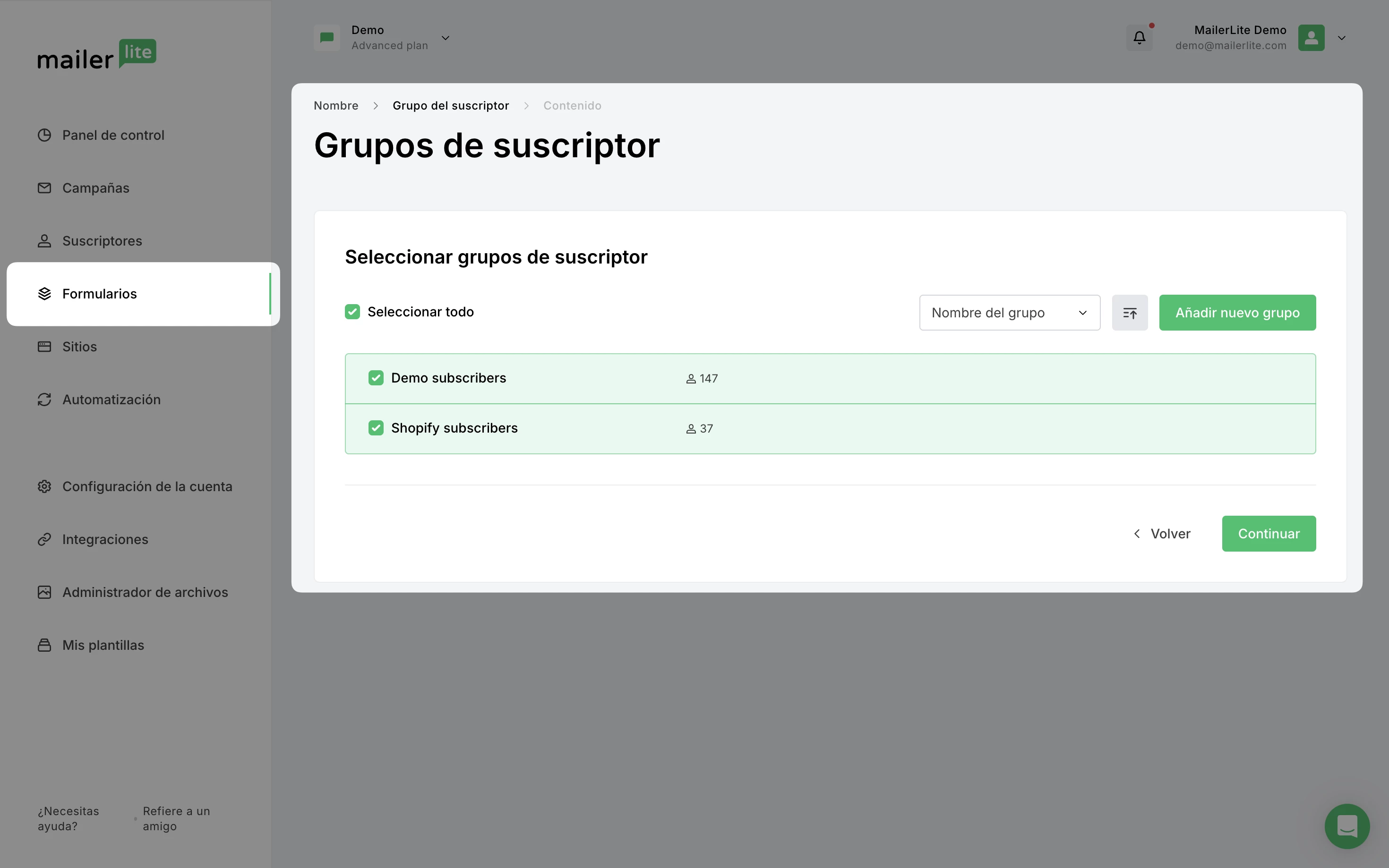 Ve a la página Formularios y crea un formulario. Se te pedirá que selecciones los grupos que quieres adjuntar a ese formulario. Selecciona todos los grupos que quieras incluir en tu lista de grupos de interés.