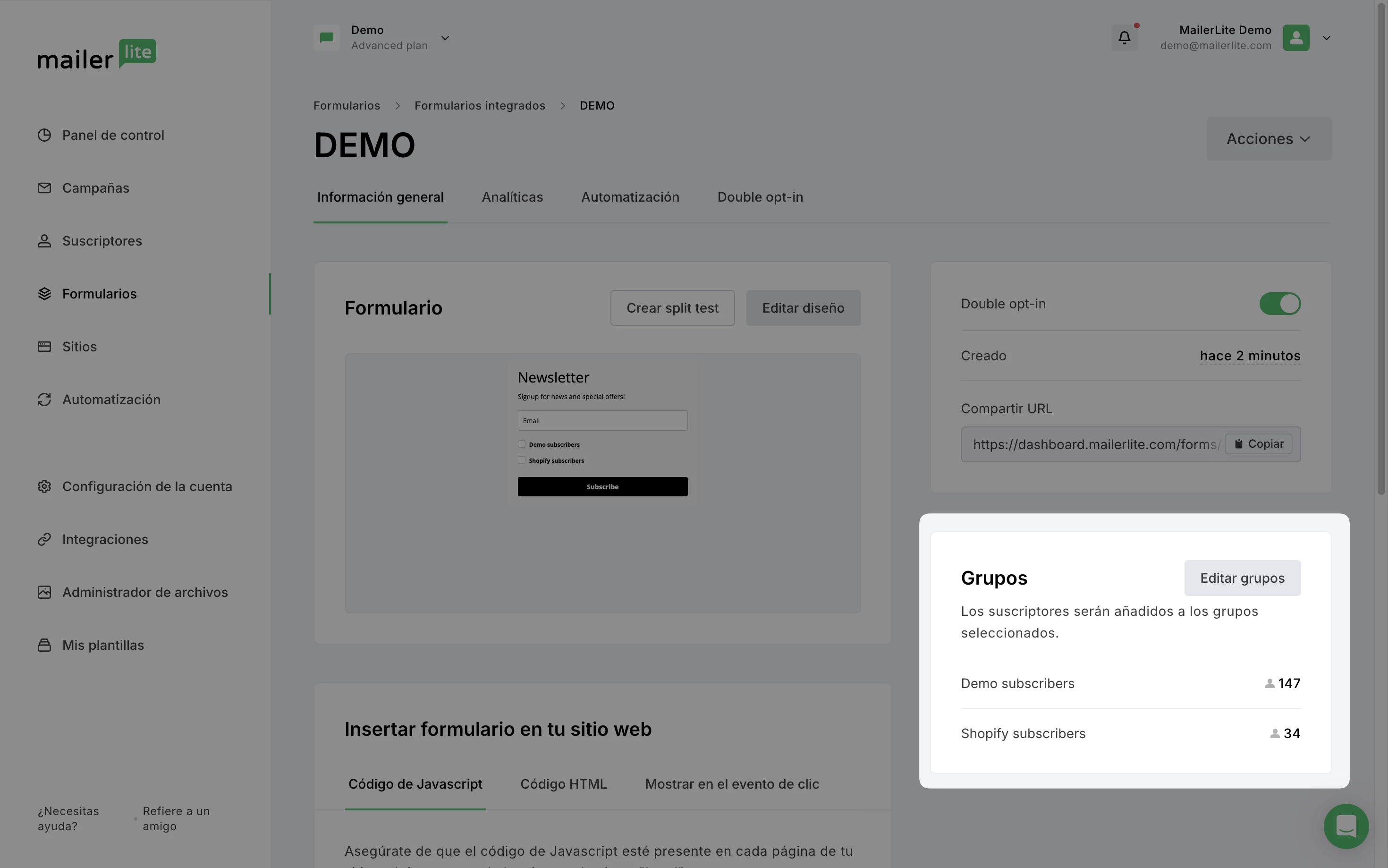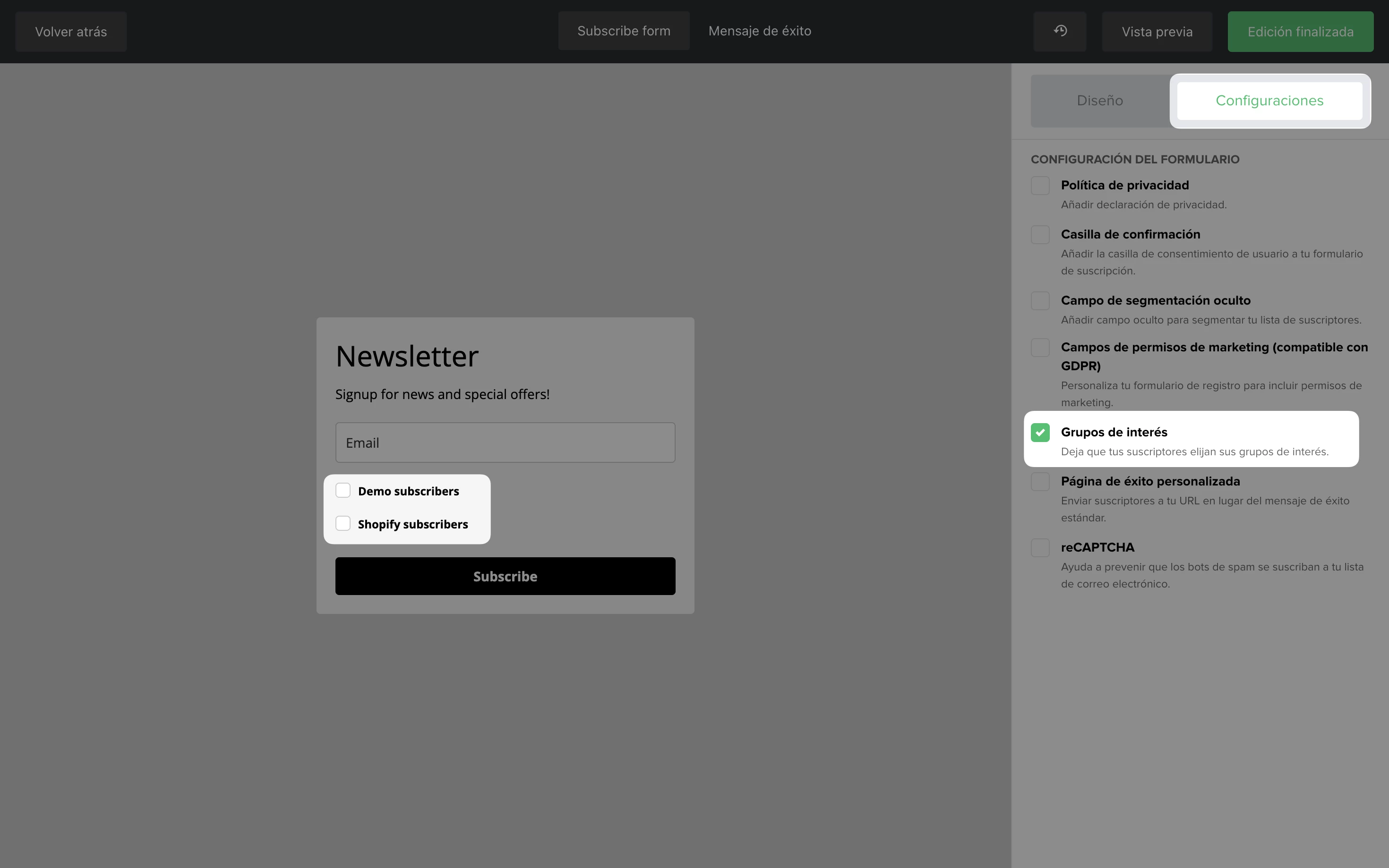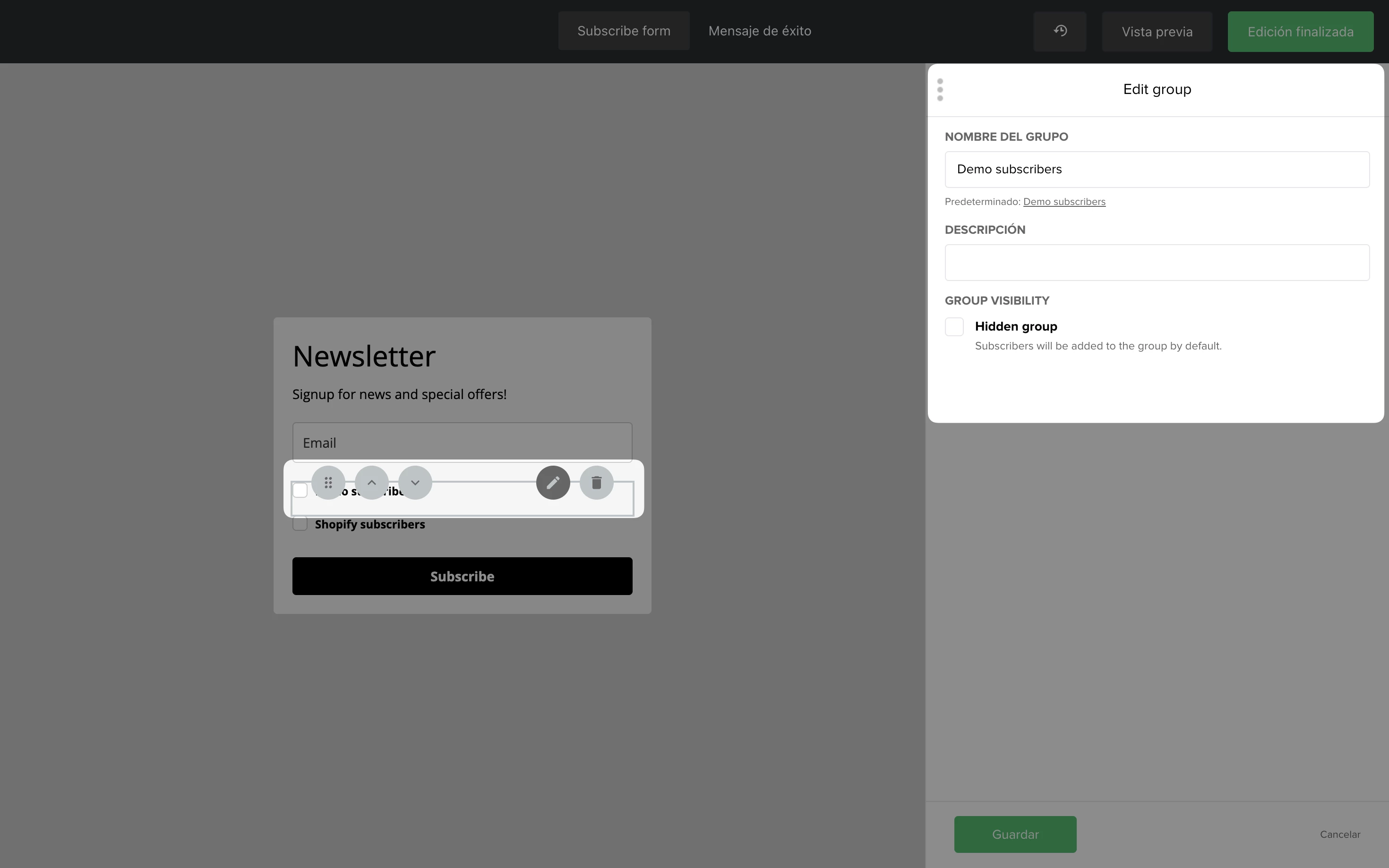 Si quieres ocultar algún grupo, marca la casilla Grupo oculto. Todos los suscriptores de tu formulario de suscripción se añadirán automáticamente al grupo oculto, así como a cualquier grupo de interés que ellos mismos seleccionen.