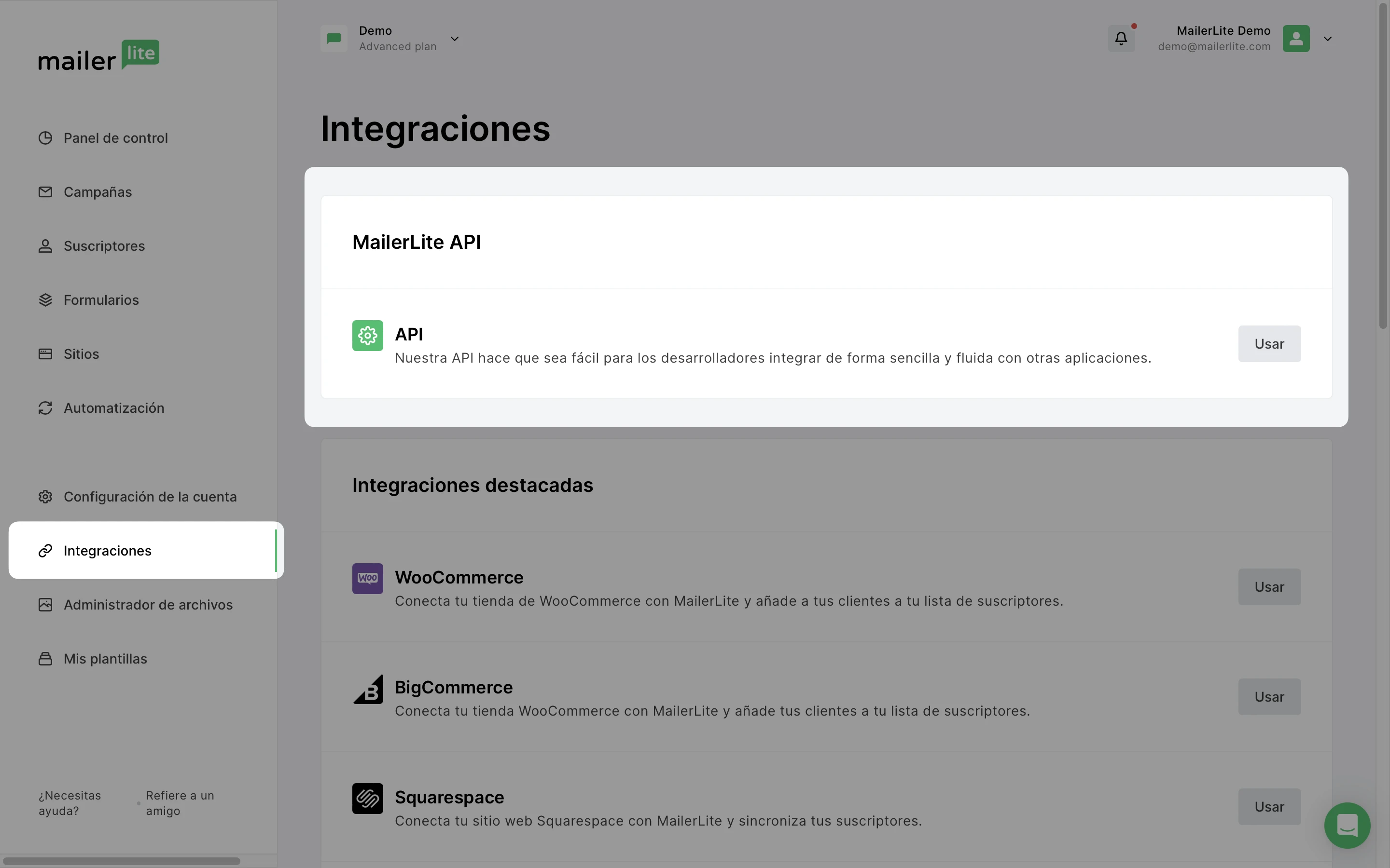 1. En tu cuenta de MailerLite, ve a la página Integraciones.