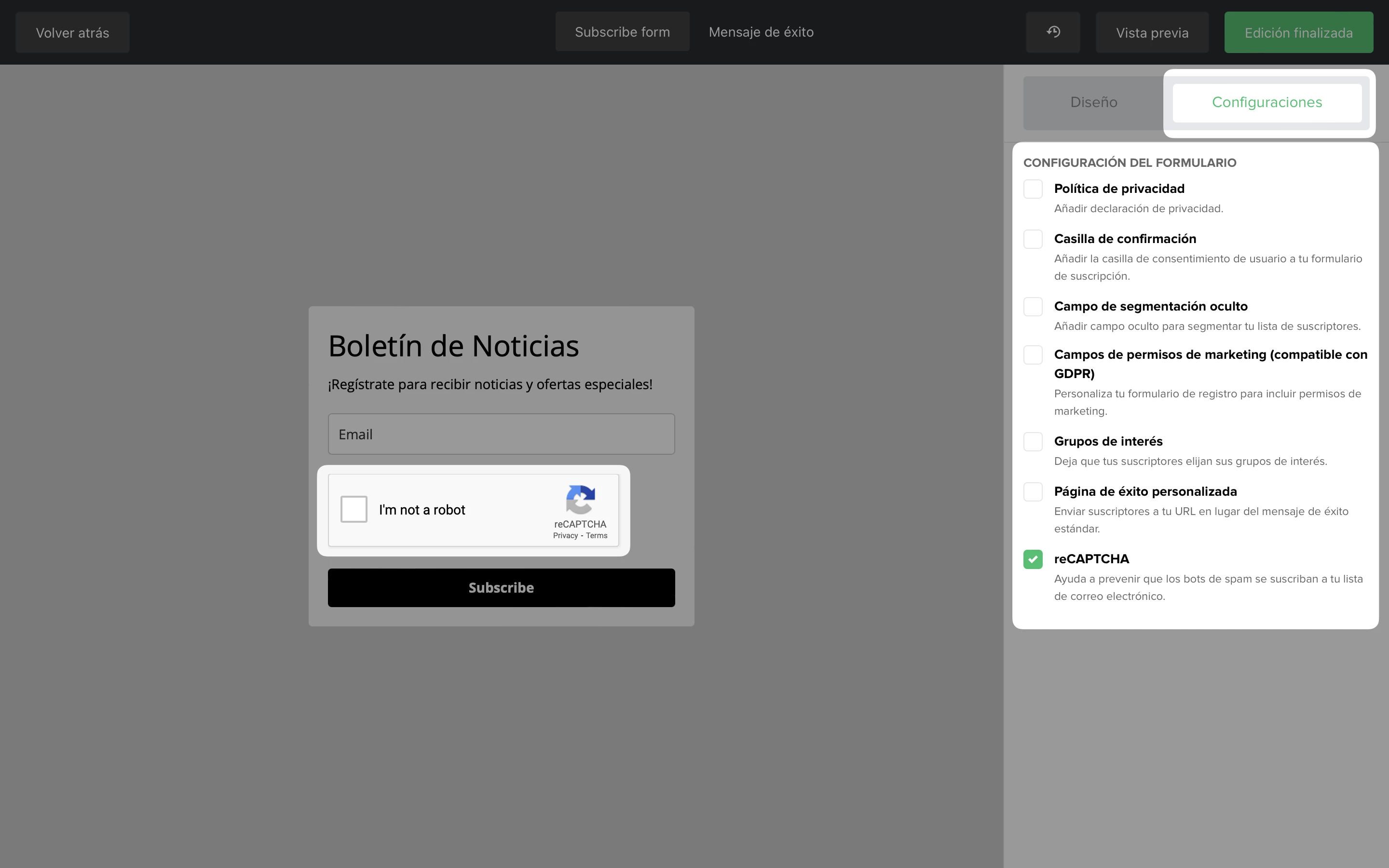 Nota: Si deseas utilizar reCAPTCHA pero no utilizas formularios creados en MailerLite, comprueba que la plataforma que utilizas es compatible con reCAPTCHA o considera la posibilidad de cambiar a los formularios de MailerLite..