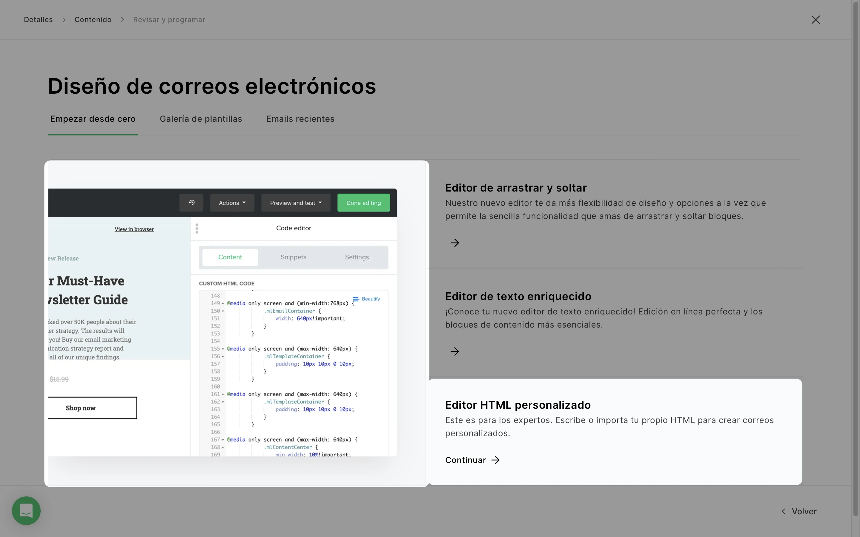 Elige el tipo de campaña - elige el editor HTML personalizado.
