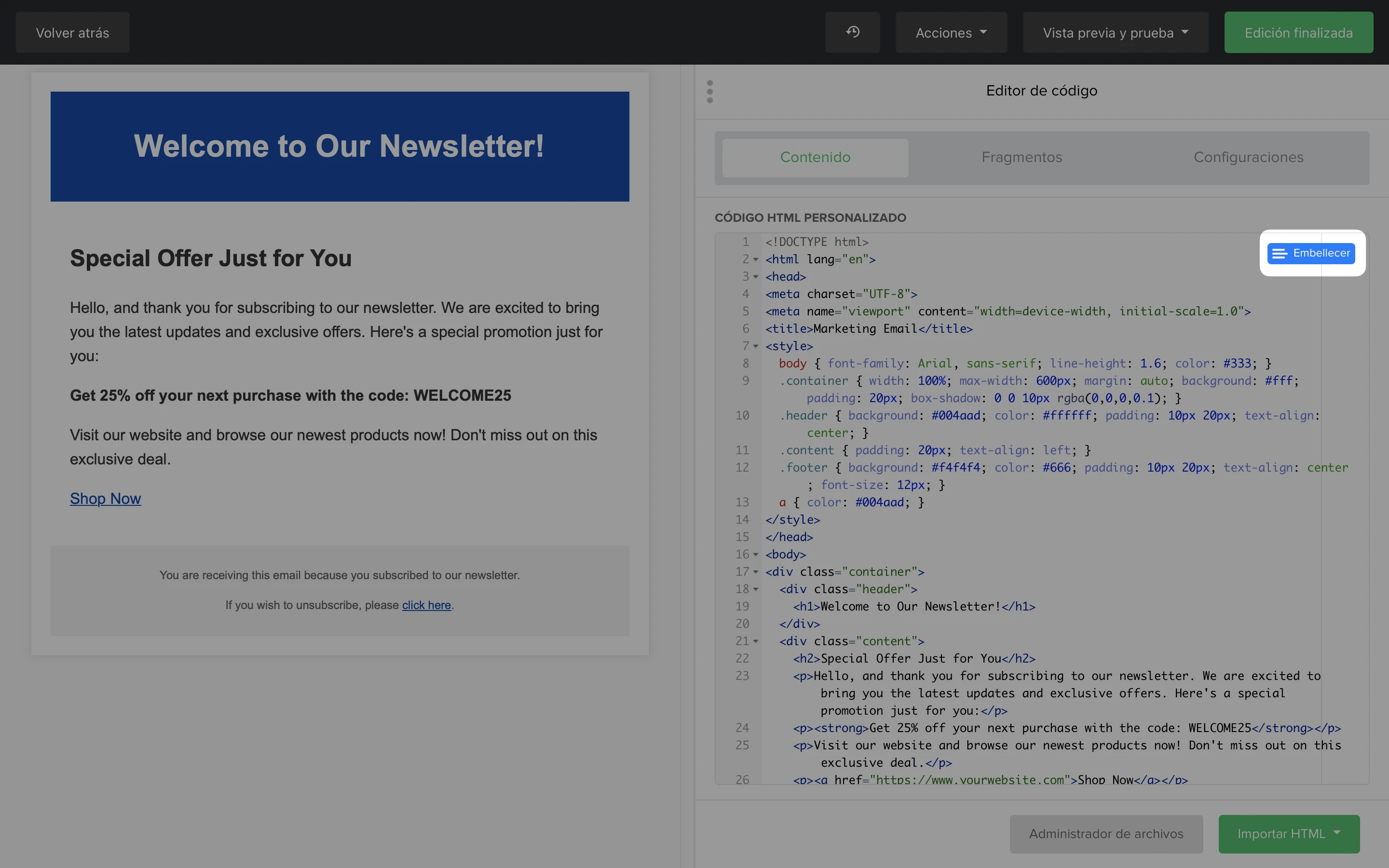 Después de copiar y pegar varios elementos en tu newsletter, es posible que necesites limpiar tu código (por tu propia paz mental). Para ordenar tu código, simplemente haz clic en el botón Embellecer en la pestaña Contenido.