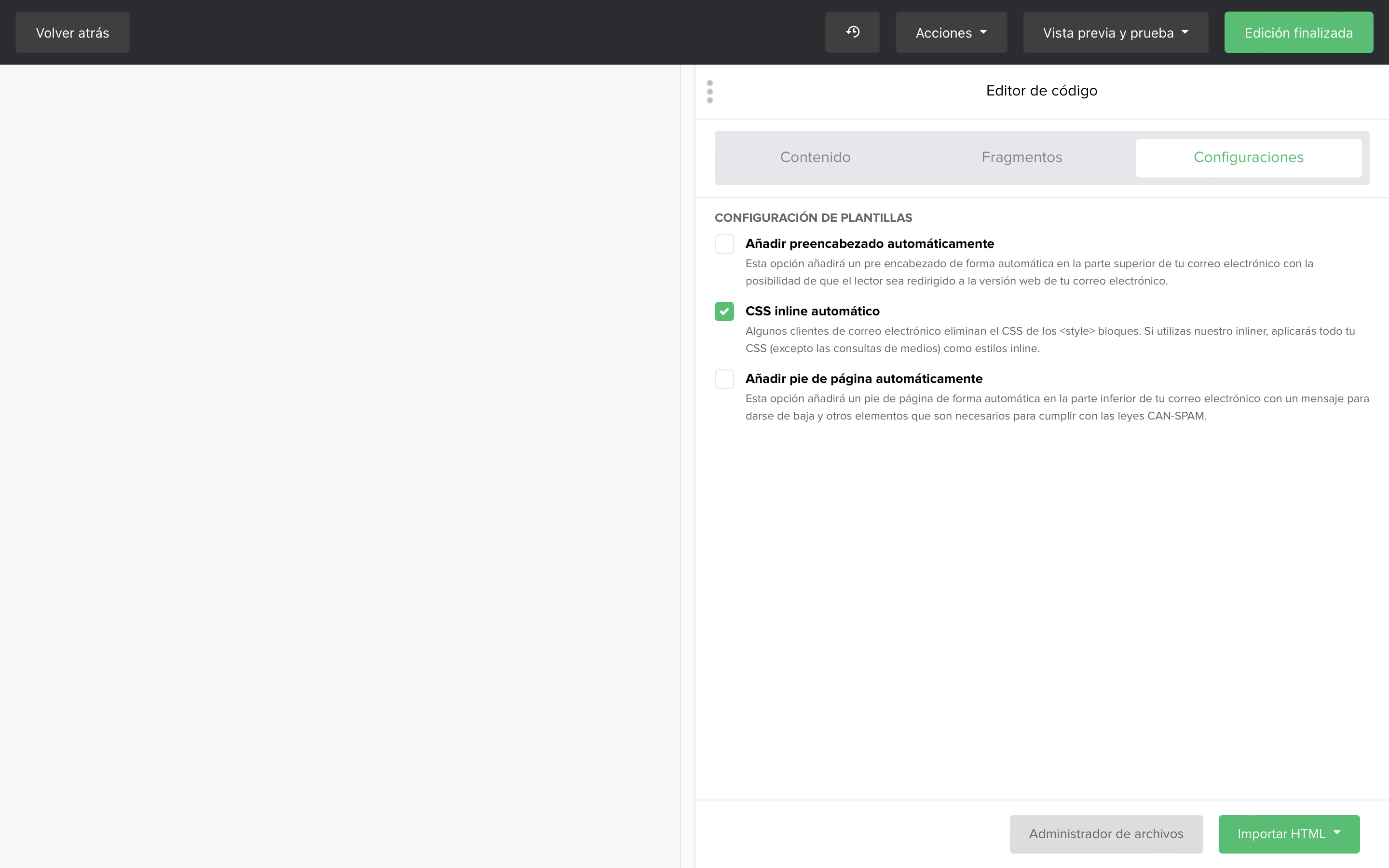 Si eres nuevo en el diseño de newsletter personalizados, te recomendamos incluir tu CSS. Puedes convertir tu CSS existente a estilos en línea usando nuestro inliner: